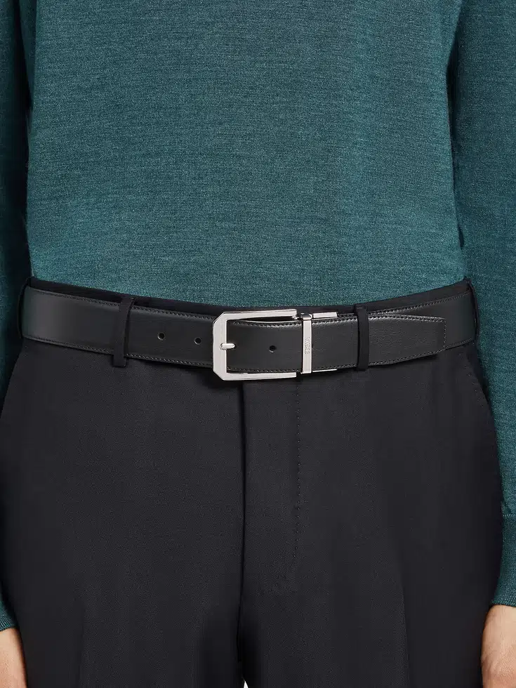 • Metal buckle with palladium finish• Width: 3.5 cm / 1.4 in• Fully adjustable• Reversible belt• Front in black leather, reverse in dark brown smooth calfskin• Made in Italy