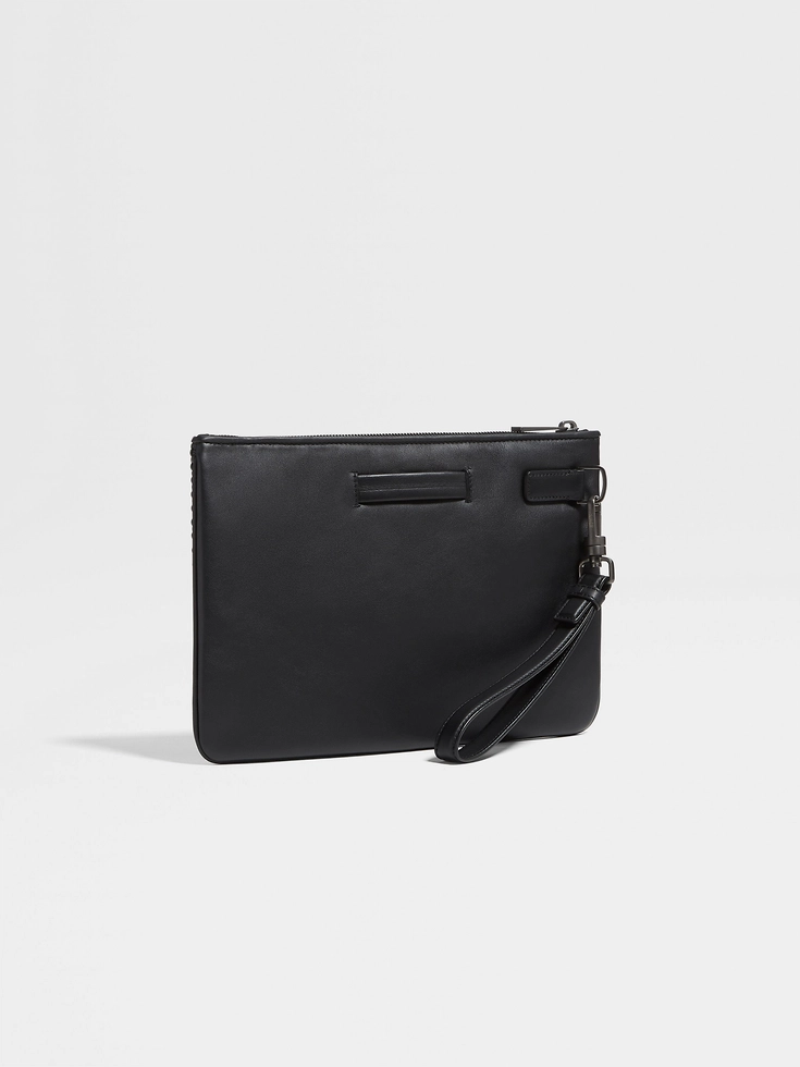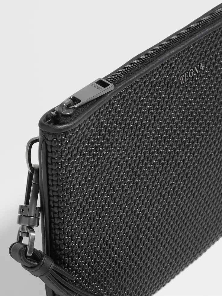 The multifunctional, black PELLETESSUTA™ leather pouch is presented in Zegna’s iconic woven leather. This sophisticated choice of material is accentuated with glazed ultrablack metal finishes. Slip it into your backpack or travel bag to stay organized.
