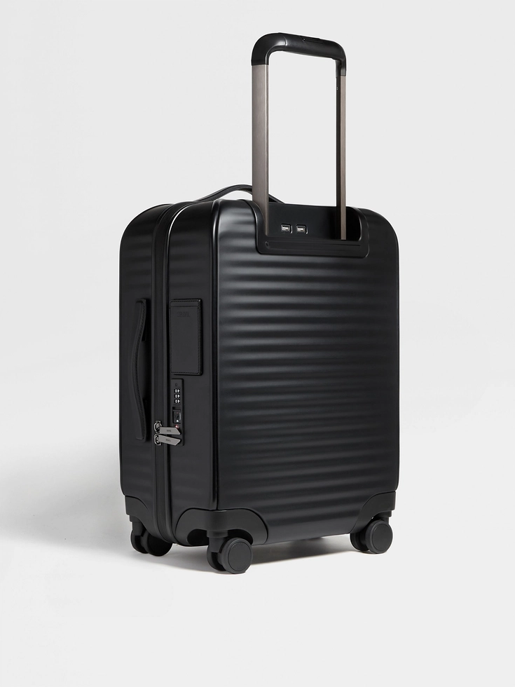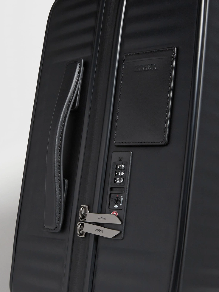 Mounted on sturdy wheels, the black polycarbonate trolley is the latest addition to Zegna’s elegant luggage collection. The wheeled suitcase offers plenty of storage space and zips securely shut. Leather handles and silver metal finishes add unmistakable flair.