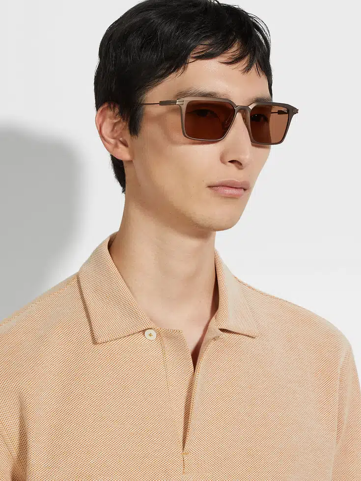 Crafted from ultra-flexible dark brown aluminum and metal, these sunglasses stand out with soft volumes and convex grooves for a refined three-dimensional finish, pairing a striking rectangular front with barely-there temples that float effortlessly on the face. Adjustable nose pads and grip paddles on the temple tips ensure a secure fit, whilst our iconic 232 Road Brand Mark signs off the looks with ZEGNA’s signature elegance.