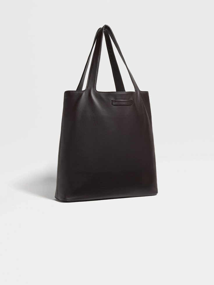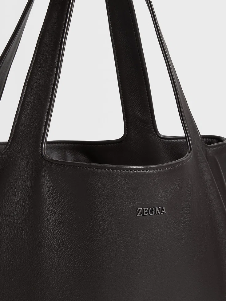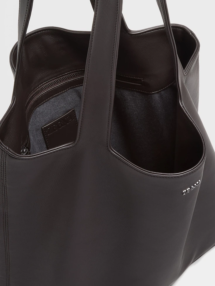 Thanks to its flexible exterior and spacious design, the dark brown SECONDSKIN tote bag is perfect for travel or errands around town. Soft cotton lining protects your belongings. The leather tote bag is set off with satin ultrablack finishes and the Zegna Logo for a final accent.