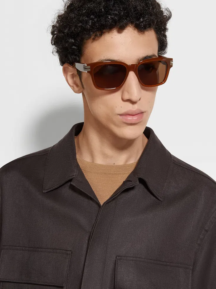 With their squared design and thick temples, the Foliage acetate sunglasses make the most of their modern material. The shiny Foliage acetate is paired with brown lenses, while the metallic Zegna 232 Road Brand Mark on the temples adds a pop of contrast. The ends of the temples are fitted with grip inserts for a secure fit.