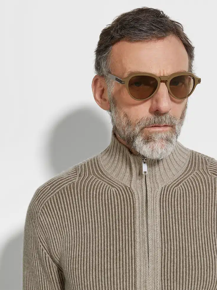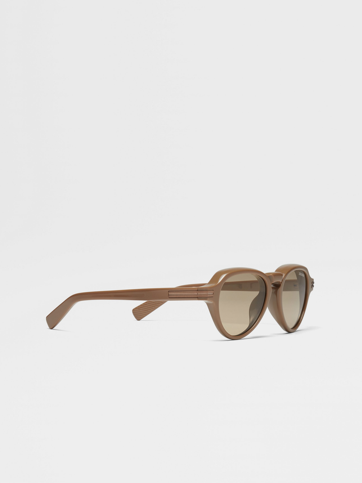 Boldly designed with a shiny finish, these light brown acetate sunglasses boast a single-bridge frame with pronounced, rounded volumes. Grip paddles at the temple tips improve the fit, while a striking Zegna 232 Road Brand Mark adorns the corners. The strong geometric shapes and distinct beveling create a visually impactful look, making these sunglasses a stylish, modern accessory.Perfect as a gift for those who appreciate style.