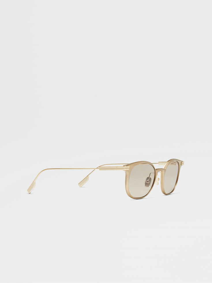The light gold aluminum sunglasses feature a bold, angular design that combines modern aesthetics with high-quality materials. Crafted from lightweight yet durable aluminum, these frames feature a polished profile that catches the light. Fit is prioritized with custom Zegna nose pads and temple end grip paddles. Subtly branded with the Zegna 232 Road Brand Mark at the temple tips, these sunglasses are a statement piece for those who appreciate sleek eyewear.