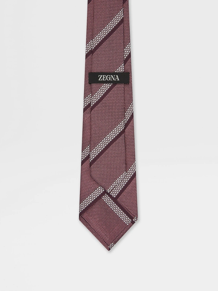 The natural brilliance of pure mulberry silk provides the perfect backdrop for a refined striped pattern with this smart tie. Presented in an elegant pink colorway.