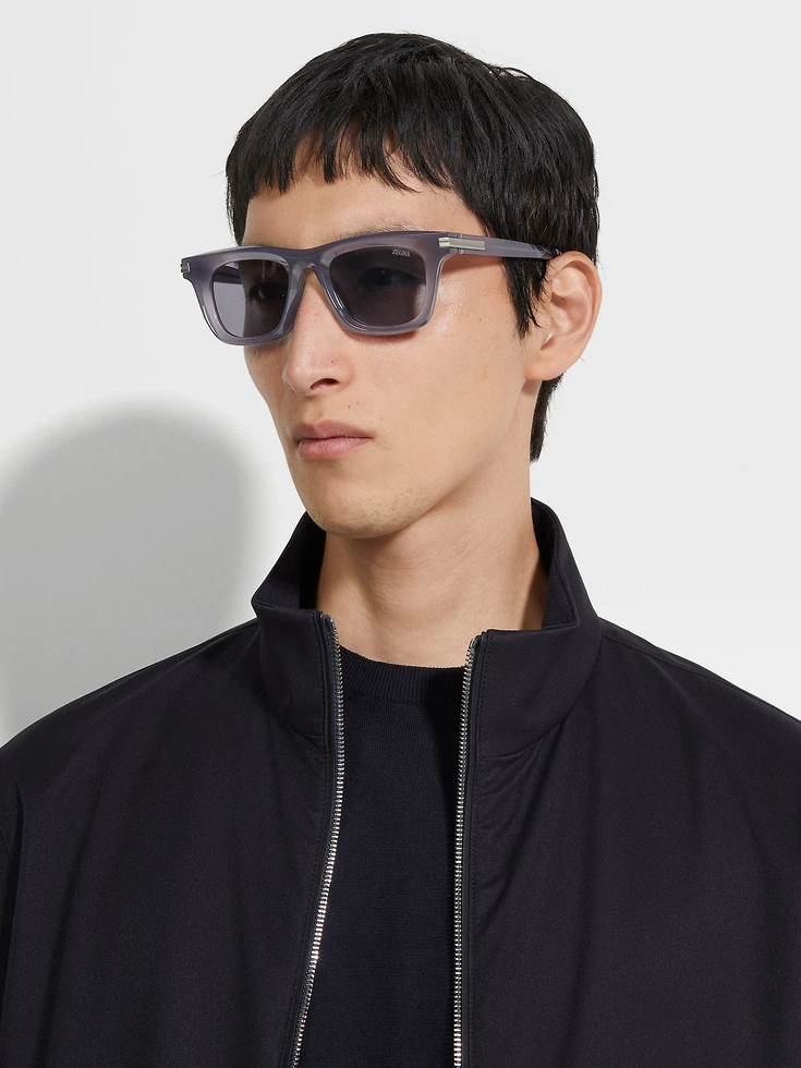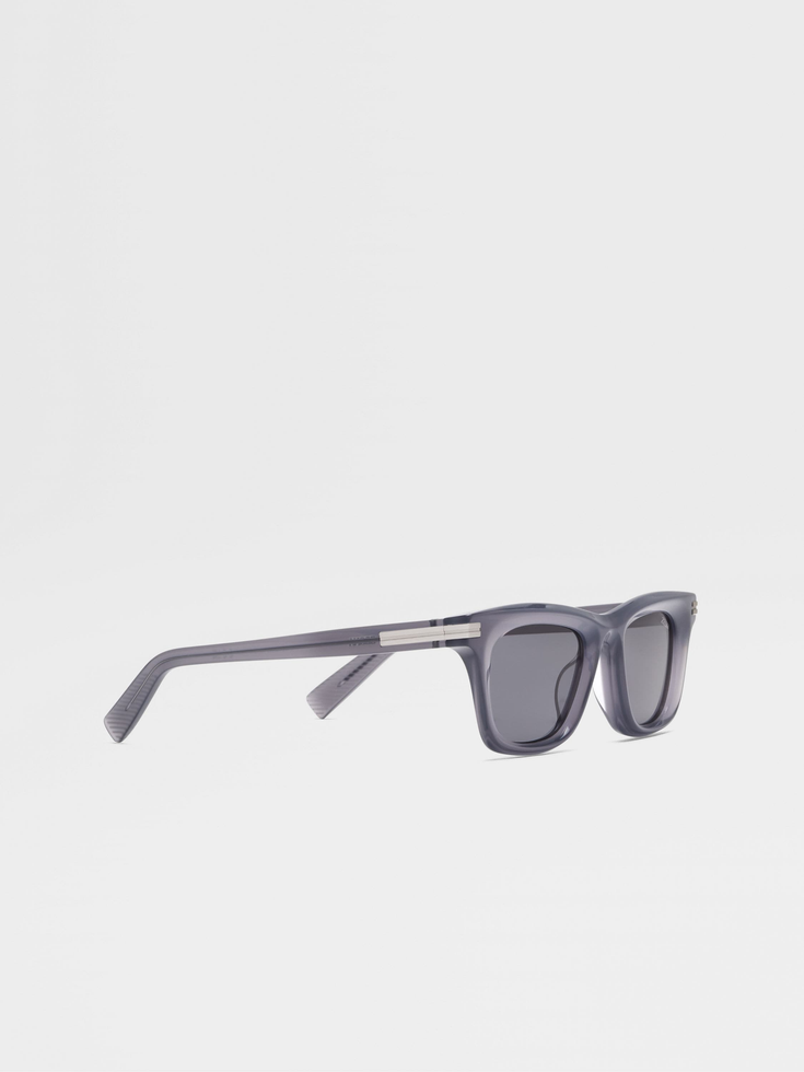 These transparent blue acetate sunglasses soften a bold rectangular silhouette with sinuously sculpted lines that seem to flow weightlessly across the face. Their construction with soft volumes and convex grooves adds a three-dimensional effect, enhancing their distinctive design. The shiny finish exudes a sleek allure, whilst a ZEGNA Logo on the left lens adds a signature touch. Enriched with our iconic 232 Road Brand Mark wrapping around the corners, these sunglasses epitomize modern sophistication.