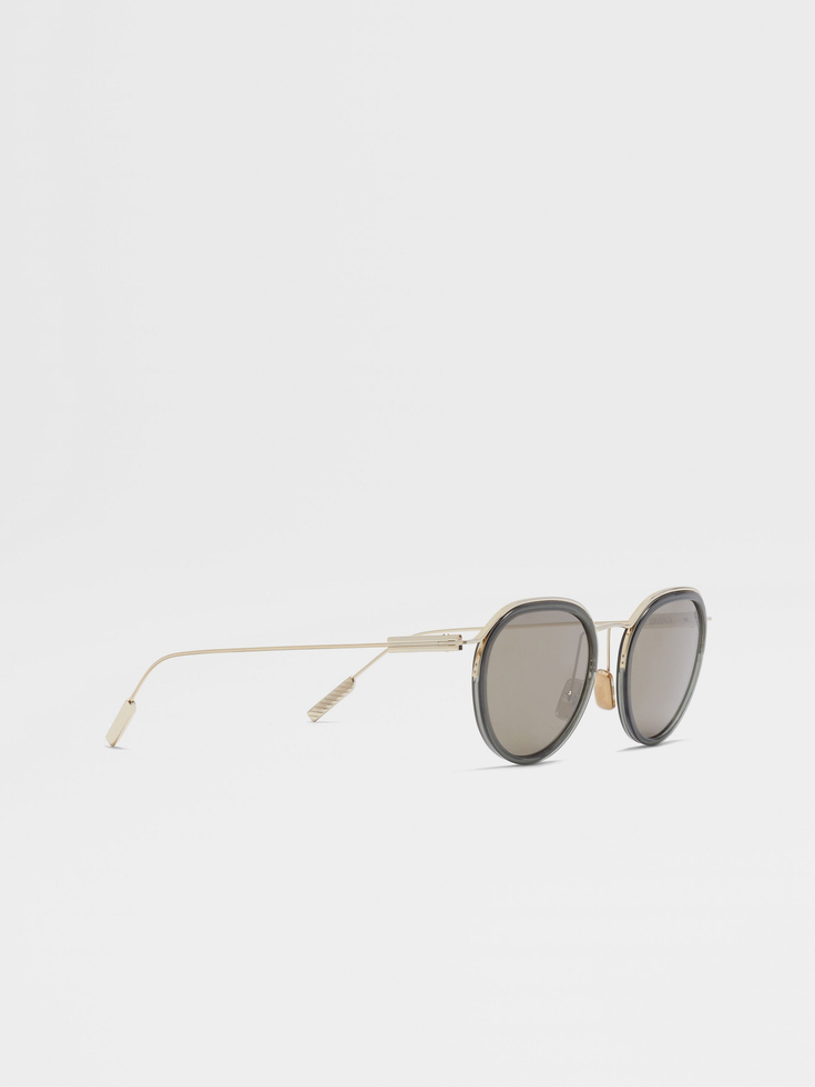 Featuring a rounded front and ultra-thin temples, the transparent green and pale gold acetate and metal sunglasses feel irresistibly fresh. Roviex and gunmetal flash lenses complement the shiny frame. The sunglasses are finished off with the Zegna 232 Road Brand Mark at the corners and temple tips.