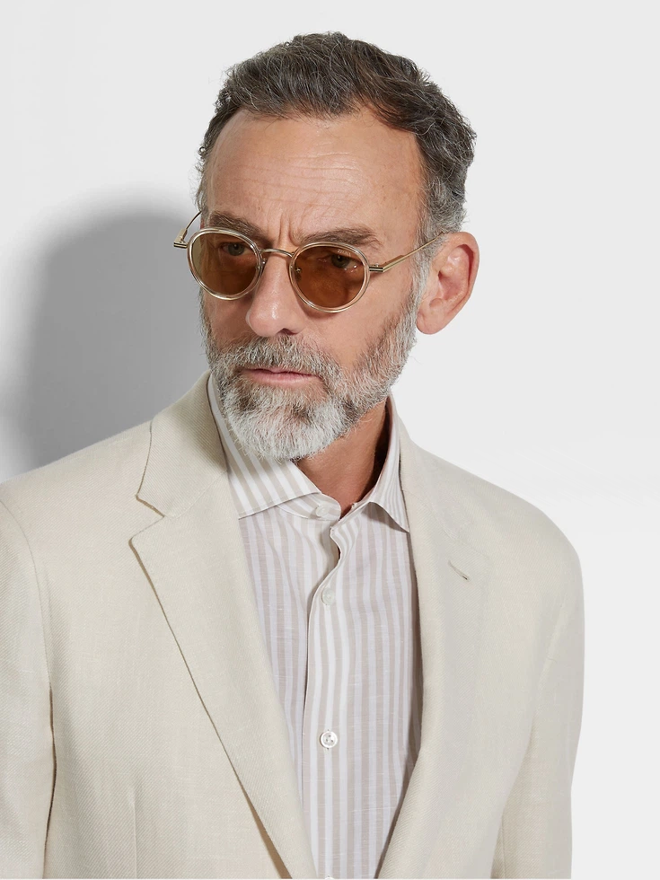 These transparent light beige sunglasses deliver lightweight comfort with a special construction that draws on the noble properties of flexible titanium: thin metal wire embraces rounded acetate with soft sweeping lines. Adjustable nose pads and grip paddles on the temple tips ensure a secure fit, whilst our iconic 232 Road Brand Mark signs off the looks with ZEGNA’s signature elegance.
