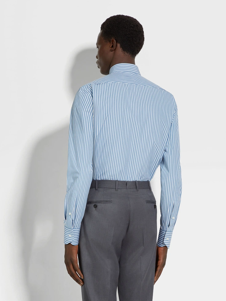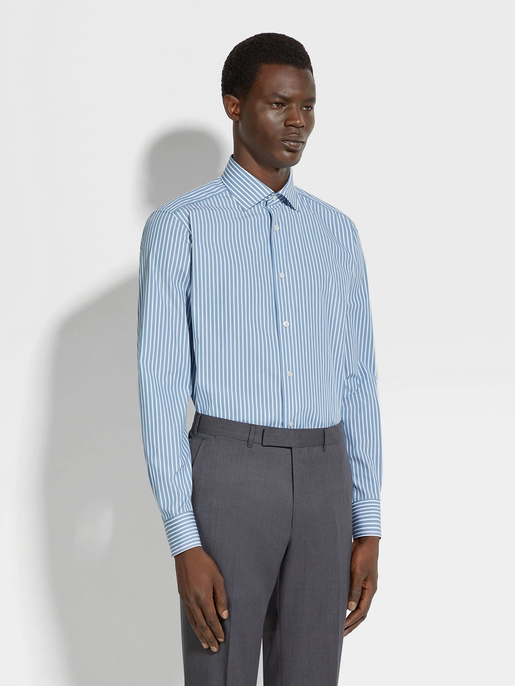 This shirt is crafted from ZEGNA’s exquisite Centoventimila cotton, featuring a macro-striped pattern in a timeless avio blue and white colorway. The classic silhouette is styled with long sleeves and a semi-spread collar.
