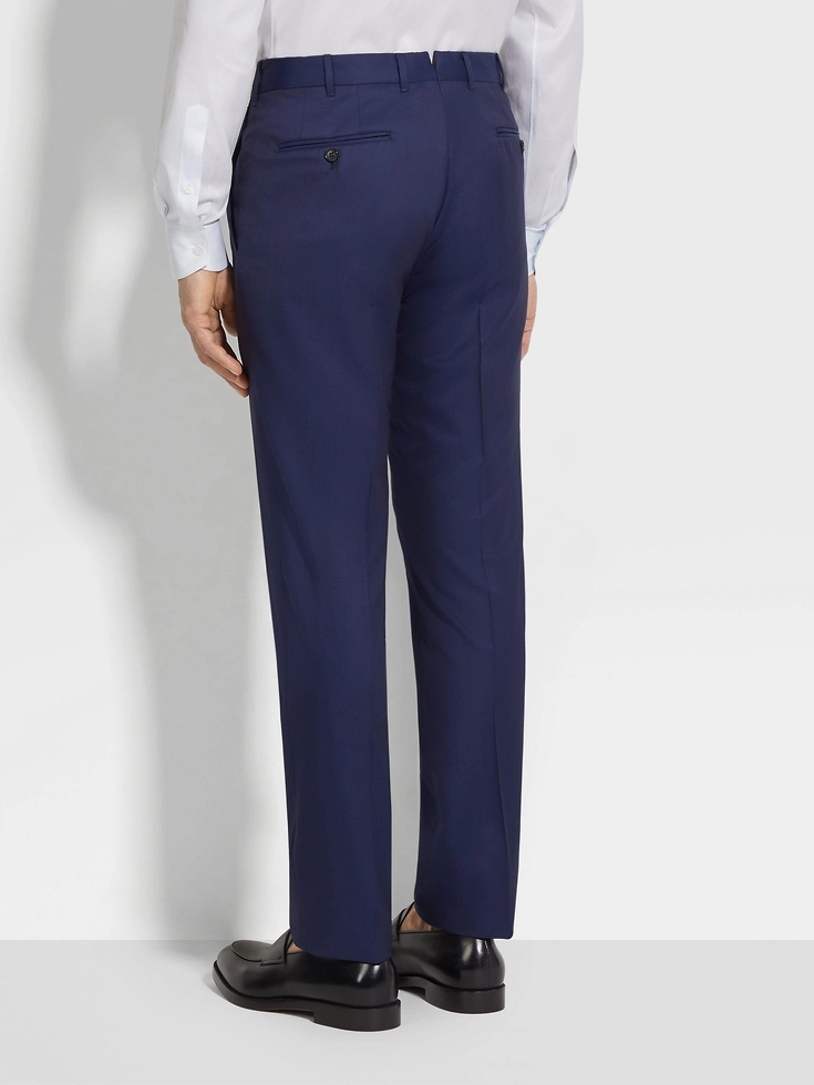 Embrace the power of quiet luxury in these blue flat-fronted pants, crafted from ultra-lightweight Centoventimila wool for a sublime drape and silky soft feel. Styled with a slim leg and hook closure.