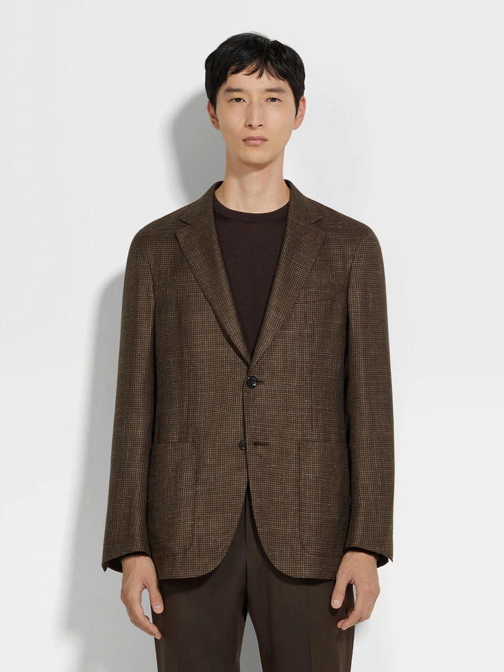The epitome of effortless elegance, this cardigan jacket is crafted from a luxurious cashmere, silk and linen blend, woven with a timeless houndstooth pattern in brown and dark brown. Styled with classic notch lapels, double vents and patch pockets.