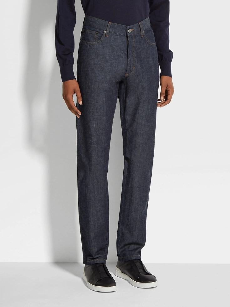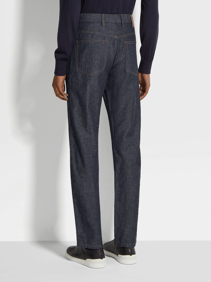 An elevated take on classic denim jeans, the dark blue rinse-washed cotton and linen Roccia jeans are made from a soft blend of natural fibers. The rinse-washed jeans are styled with the brand’s signature, slim fit.ROCCIA (‘rɔt:ʃa) — ITALIAN FOR ‘ROCK’ The inspiration for the Roccia Trousers was Born in Oasi Zegna — the home of our values in the Italian Alps. Inspired by classic workwear, they’re both hardwearing and elegant, making them a reliable foundation to any look.