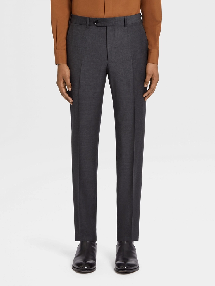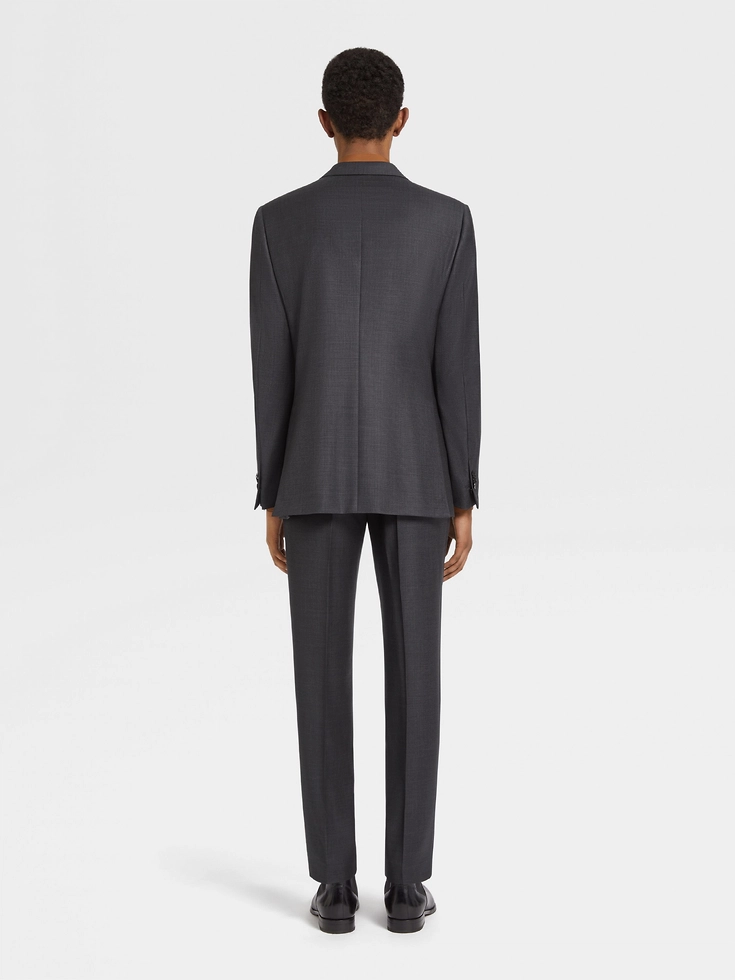 The dark grey pinpoint Trofeo™ wool tailoring suit is made from Zegna’s proprietary Australian merino wool. In addition to its superior comfort, this fabric’s smooth finish is the perfect backdrop for the understated pattern. The deconstructed jacket is paired with dart-stitched pants.