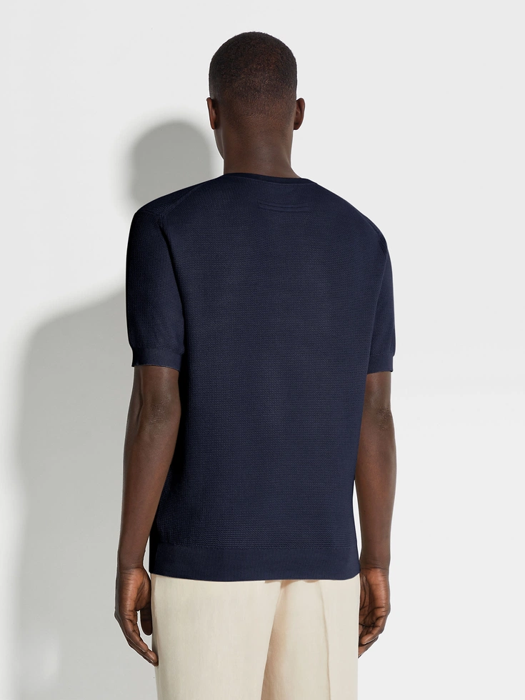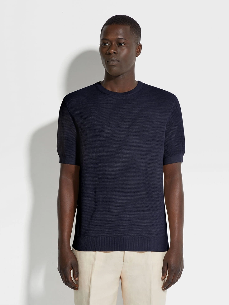 The ink blue Premium Cotton crewneck elevates a casual staple with luxury fabric. The short-sleeve T-shirt’s fine cotton honeycomb knit is presented in a solid colorway. It is topped off with a ribbed crewneck collar and matching trim.