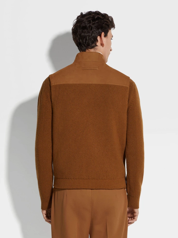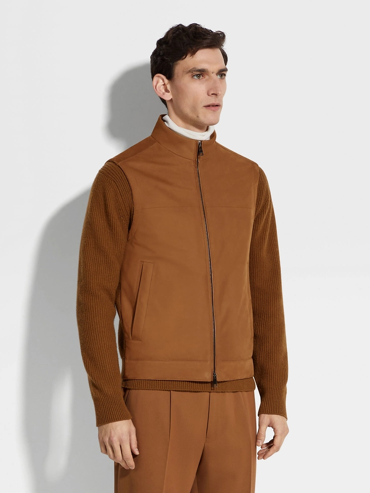 With a knit panel in the back, the Dark Foliage leather vest slides smoothly under jackets or looks chic on its own. The zip-up vest is padded and features a warm, cashmere lining. A stand collar completes the look.