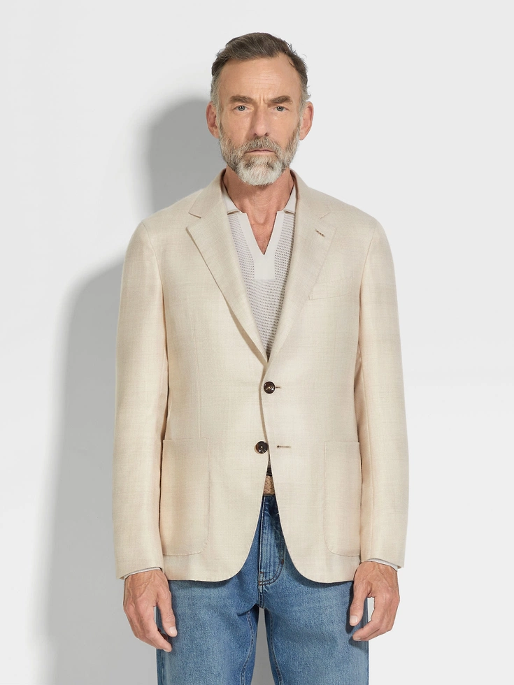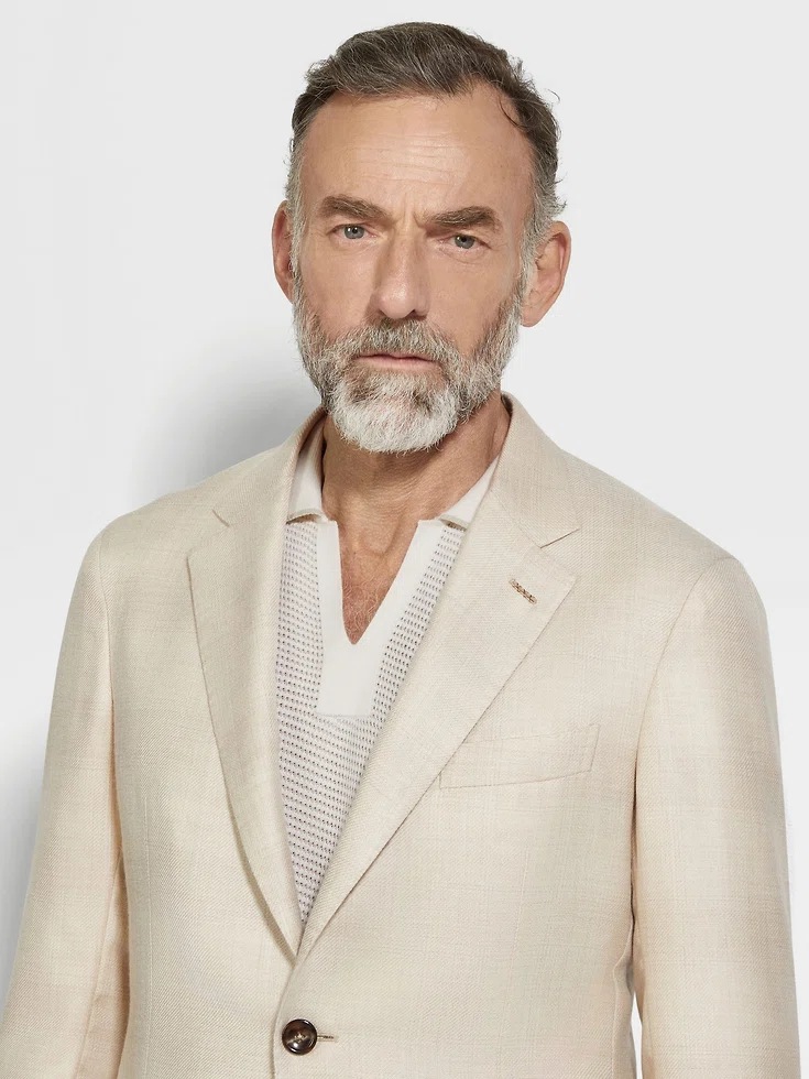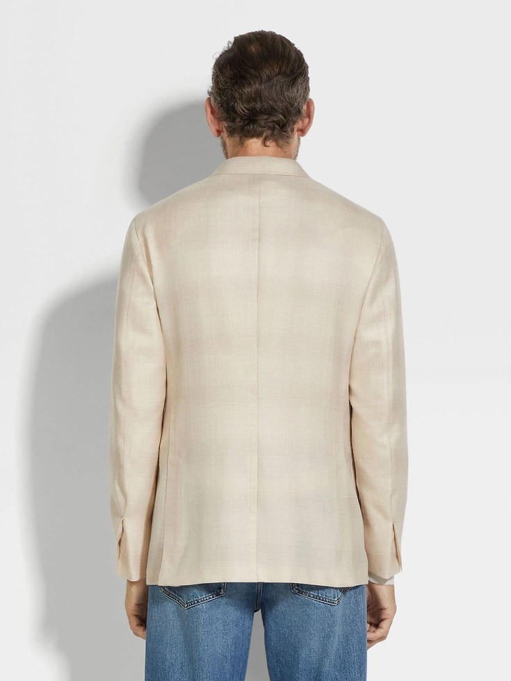 Synonymous with sartorial sophistication, this cardigan jacket is crafted from a luxurious cashmere and silk blend, woven with a refined Madras pattern in light beige and light taupe. Styled with classic notch lapels, double vents and patch pockets.