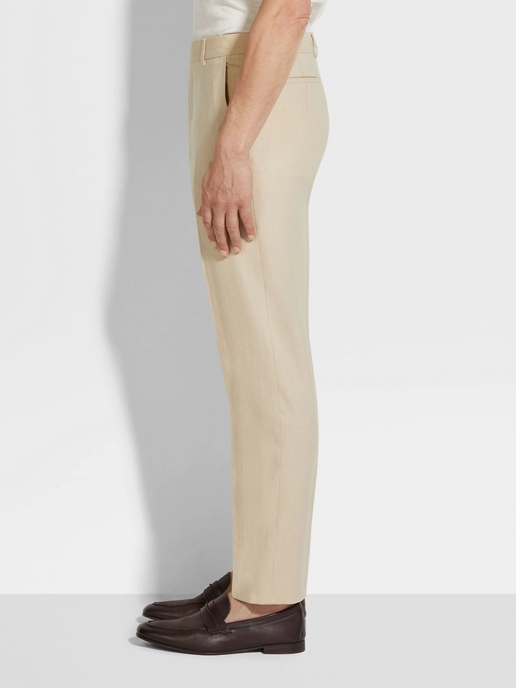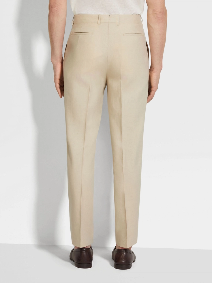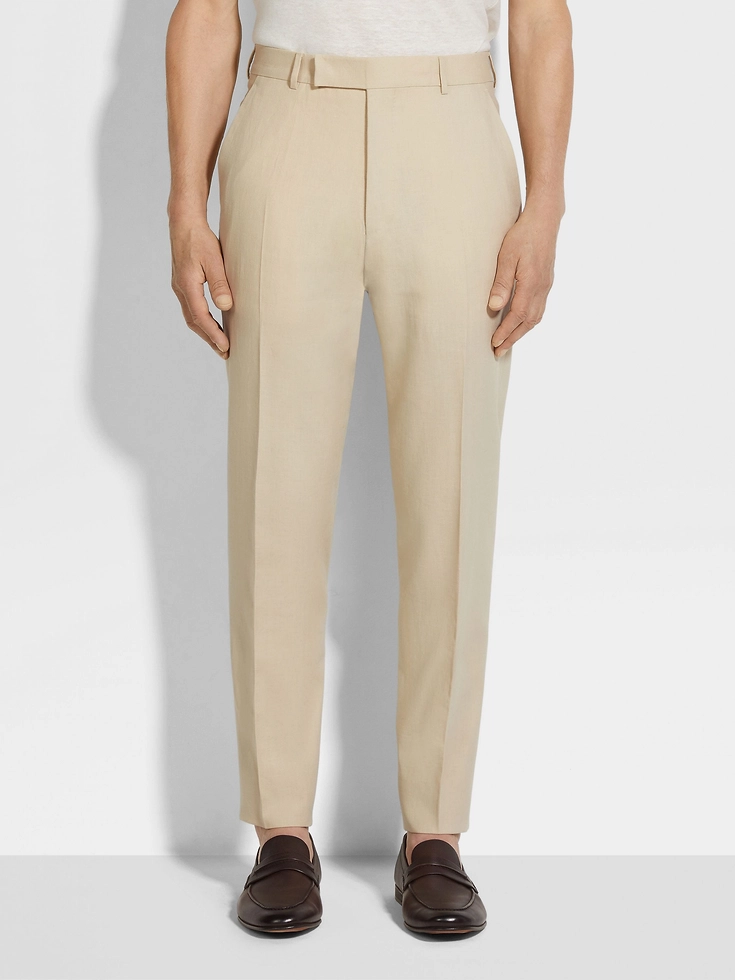 Woven from specially sourced, fully traceable flax fibers, these light beige pants showcase ZEGNA’s forward-looking vision of fine tailoring. Presented in a refined light beige colorway, their elegant slim-fit silhouette is styled with a sleek flat front and slanted pockets.