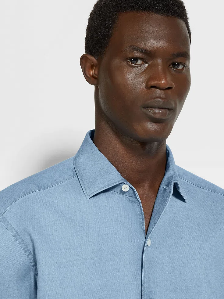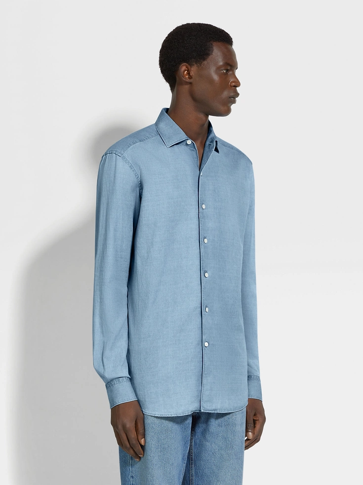 This long-sleeve shirt puts a breezy spin on classic light blue denim, blending cotton with a hint of linen. With a bleached finish for effortless laid-back charm, it’s styled with standard cuffs and a versatile rounded hem.