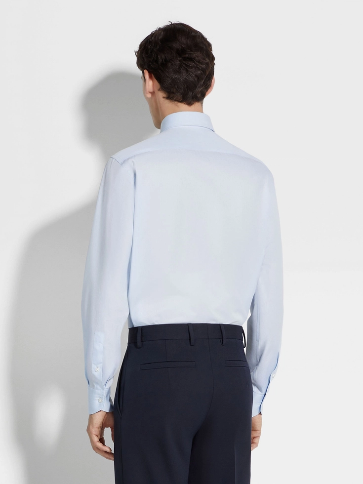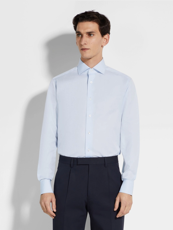 The light blue micro-striped Centoventimila cotton shirt offers a luxurious foundation for formal looks. The refined fabric is embellished with a subtle striped pattern. The long-sleeve shirt is styled with a spread collar.
