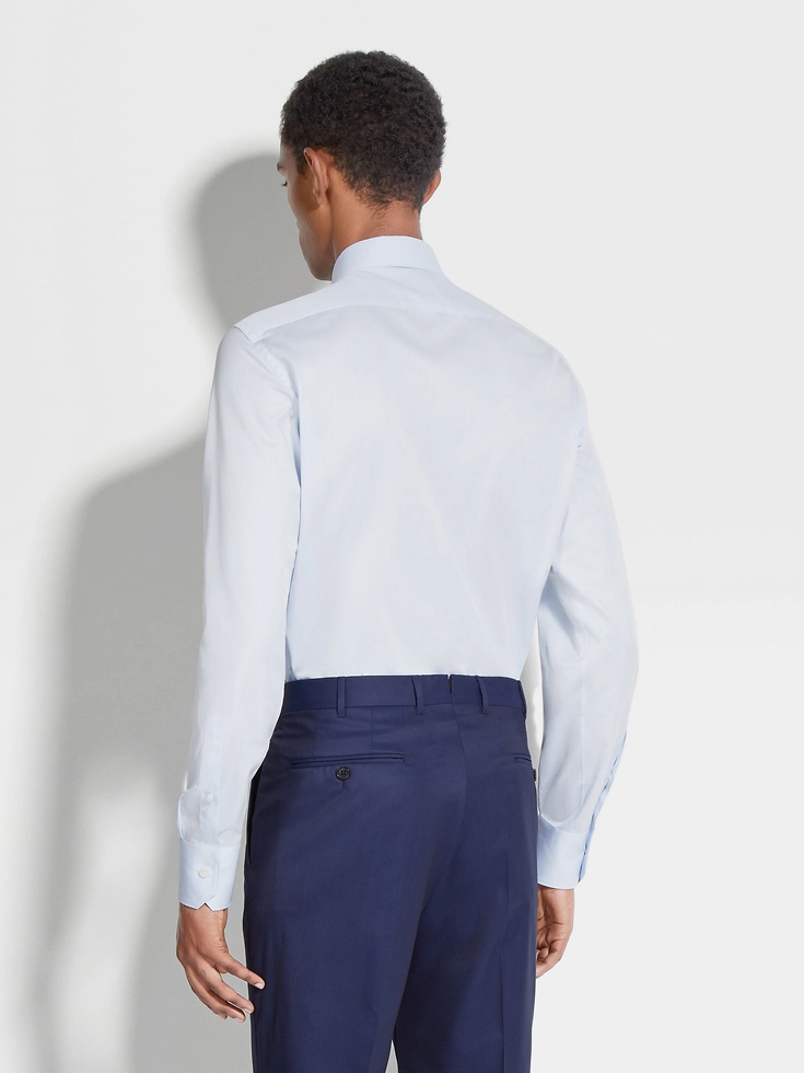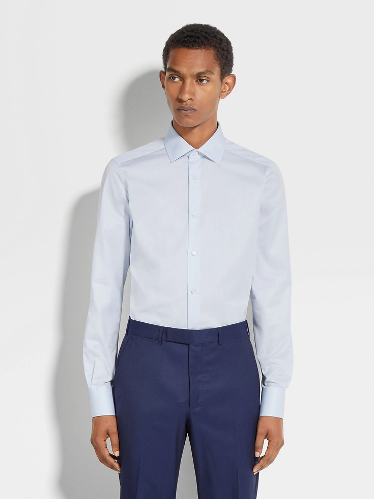 The light blue structured micro-striped Trecapi cotton shirt is naturally resilient thanks to its very fine, triple-twisted cotton fibers. This luxurious material is enhanced with an elegant pattern. The long-sleeve shirt is styled with a semi-spread collar.
