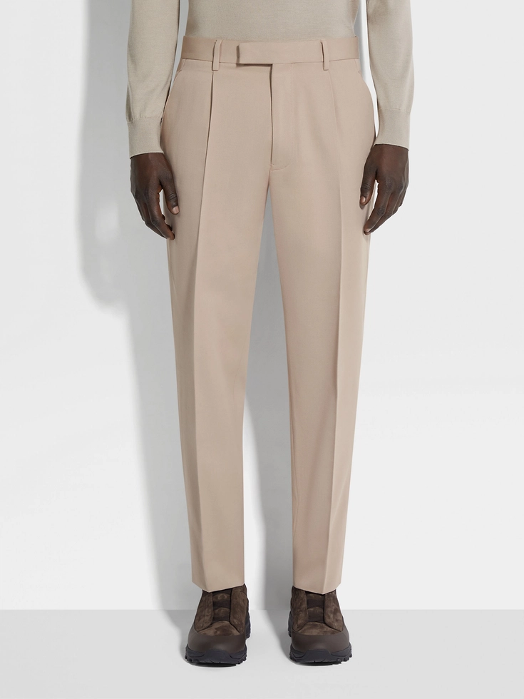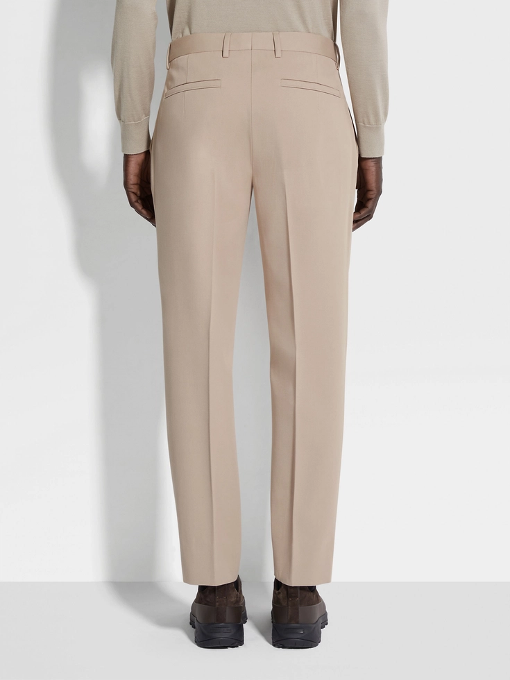 Styled with a crisp pleat in the front, the light taupe cotton and wool pants are made from a lightweight blend of natural materials. Soft and breathable, they hold their shape throughout busy days. The pants have slanted pockets and a welt pocket on the back.