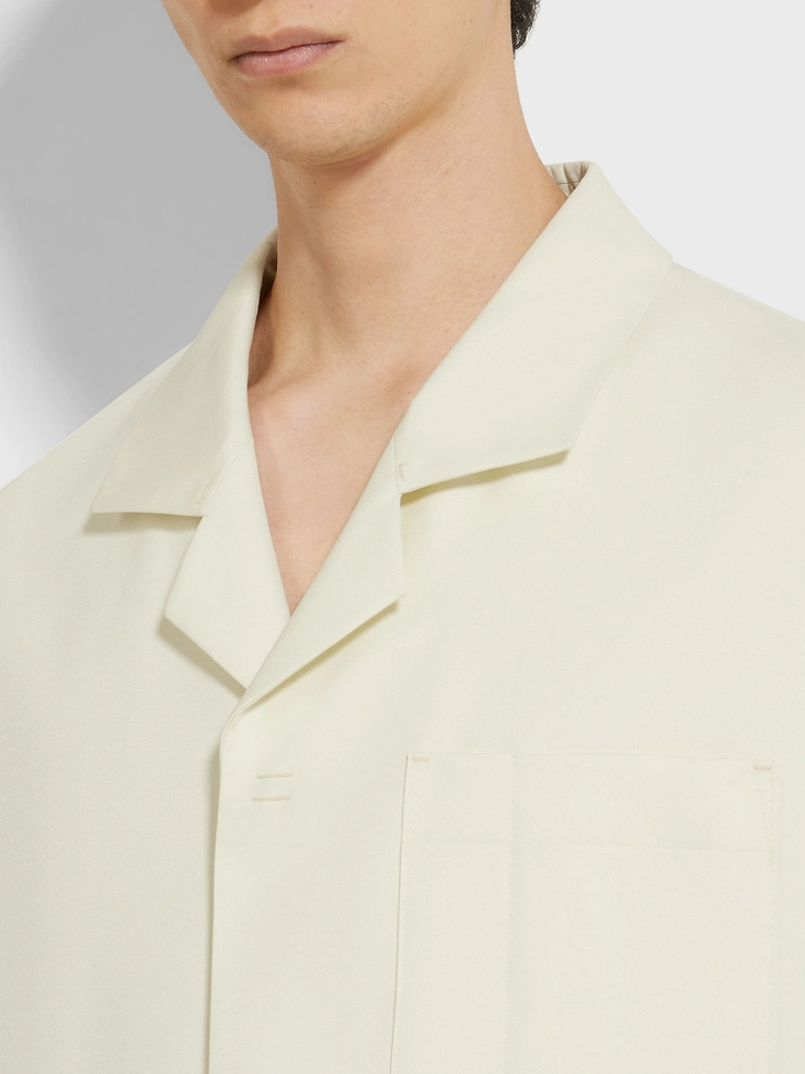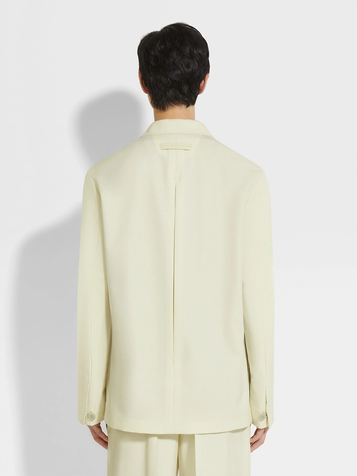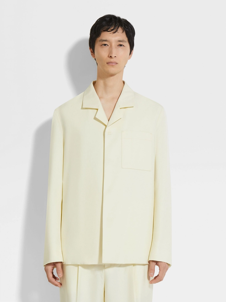 As seen on the ZEGNA runway, this shirt jacket is crafted from a refined Tussah silk and wool blend in charming light yellow. Its deconstructed silhouette is elevated with a sleek Cuban collar and a rear box pleat. Leather accents add a modern touch.