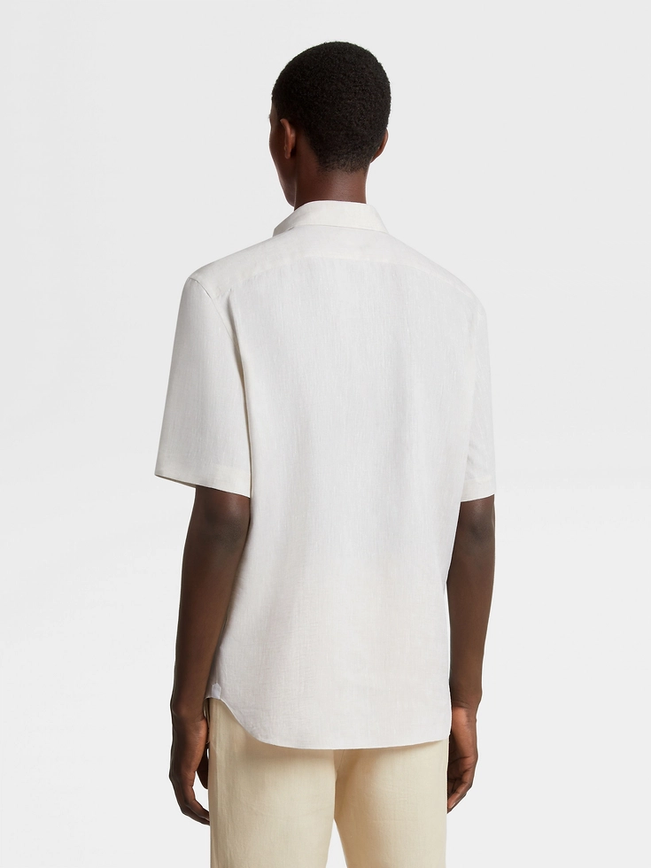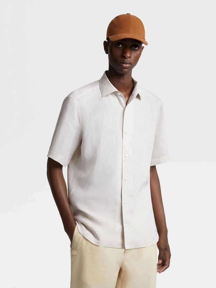 Made from a lightweight natural material, the light beige pure linen short-sleeve shirt is presented in a delicate colorway. The short-sleeve shirt is styled with a one-piece collar and hand-stitched details.