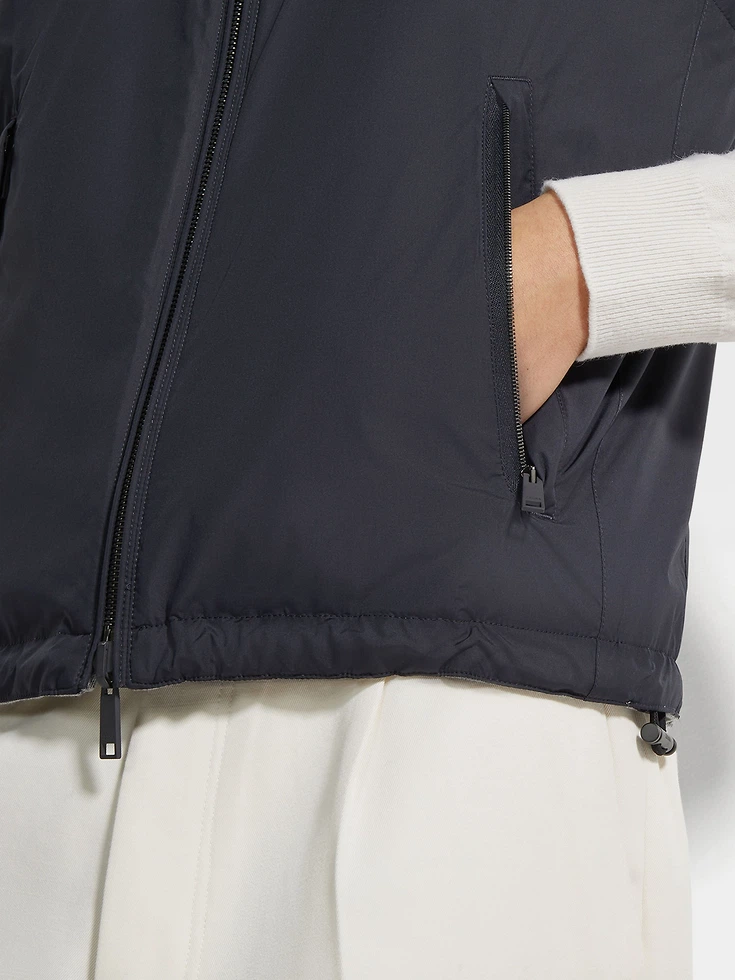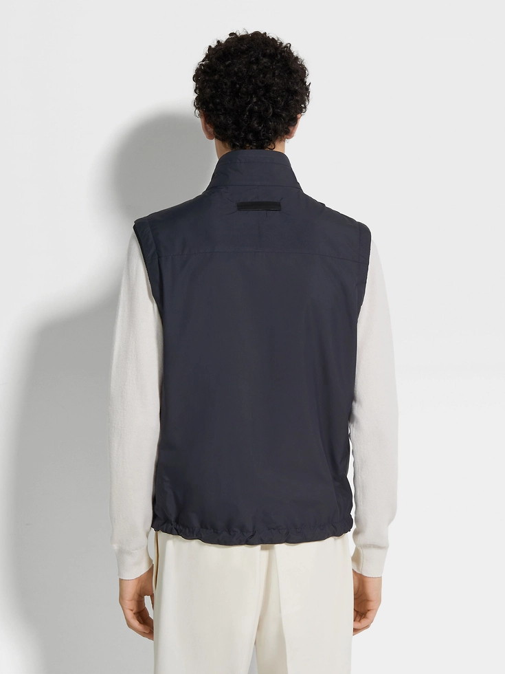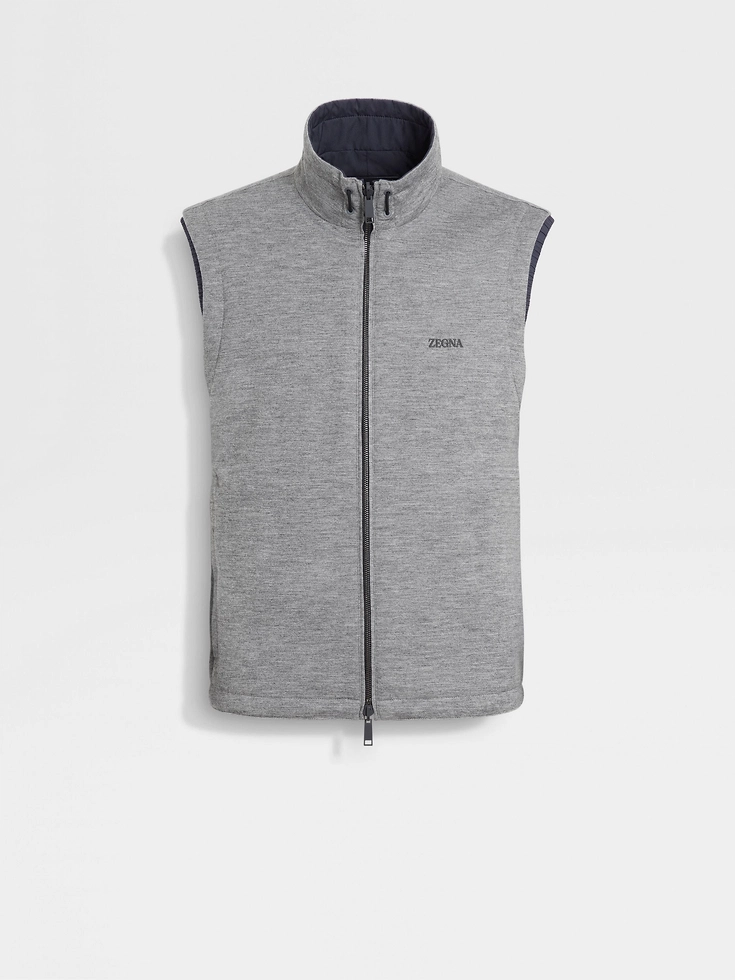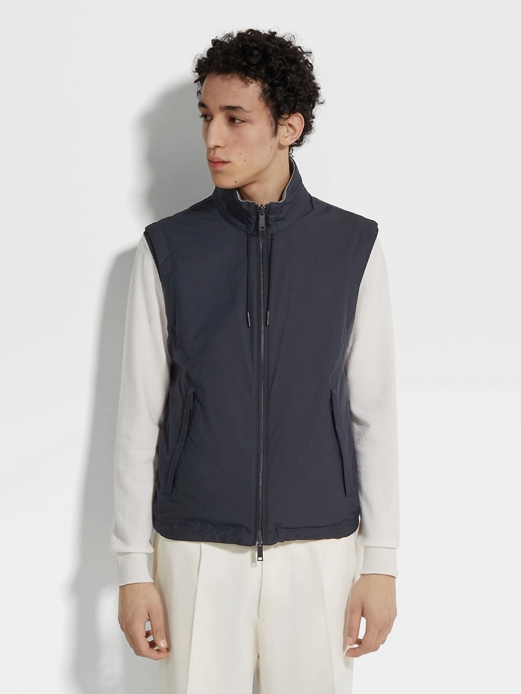 The navy blue and grey microfiber reversible Brezza vest is lightweight and effortless. Choose between the microfiber and cashmere blend jersey sides to complement different looks. The water-repellent jacket is styled with a stand collar and adjustable hem to block out the wind. The elegant colors are set off with leather drawstrings for an extra boost of style.BREZZA (‘bret:sa) — ITALIAN FOR ‘BREEZE’ The inspiration for the Brezza Windbreaker was born in Oasi Zegna — the home of our values in the Italian Alps. Made for life on the move, the fully reversible style is also water repellent, making it ideal for wearing come rain or shine.
