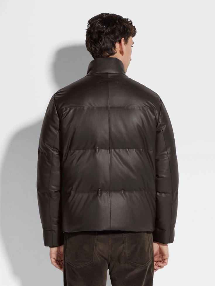 Made from pure calfskin nappa, the dark brown leather blouson has a beautiful natural texture. The jacket fastens with a zip and snaps and is topped off with a stand collar. Goose down and feather padding offers an extra layer of warmth.