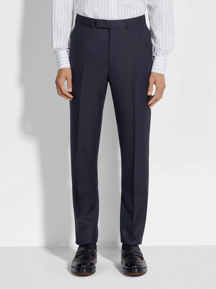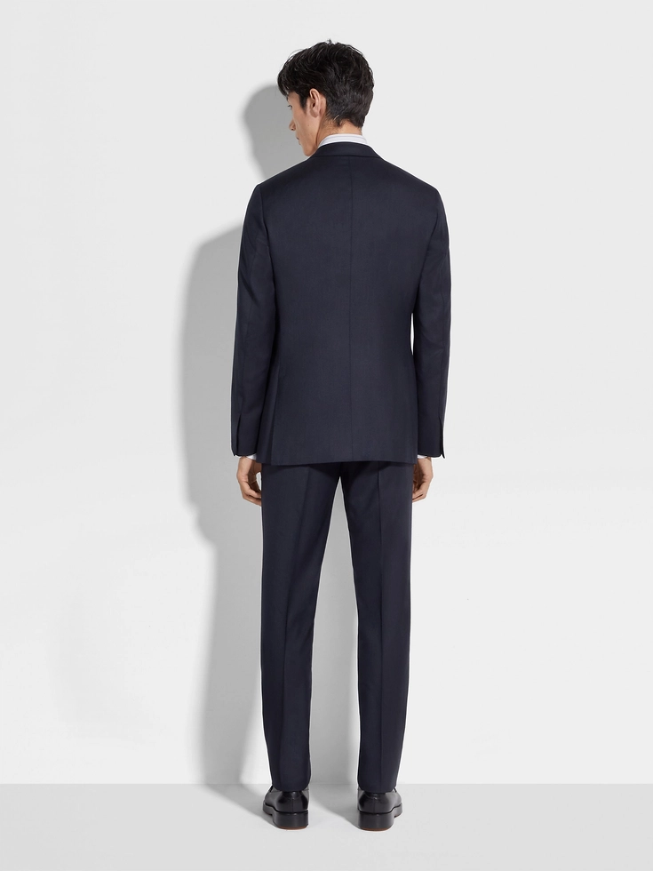 Crafted from specially selected cashmere fibers, the navy blue Oasi Cashmere suit is exquisitely soft and smooth to the touch. This special fabric is paired with a classic colorway to create a staple of elegant wardrobes. The navy blue suit is styled with flat-front pants for a streamlined look.