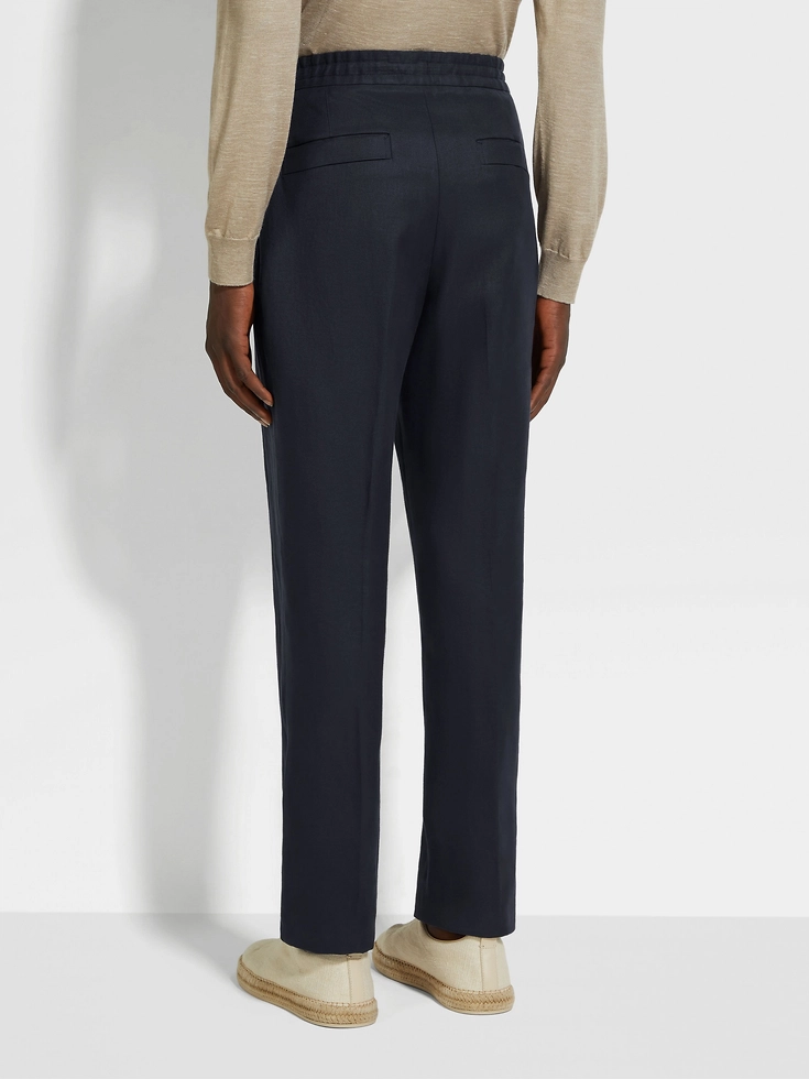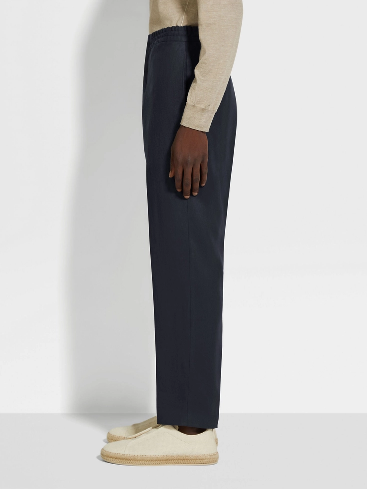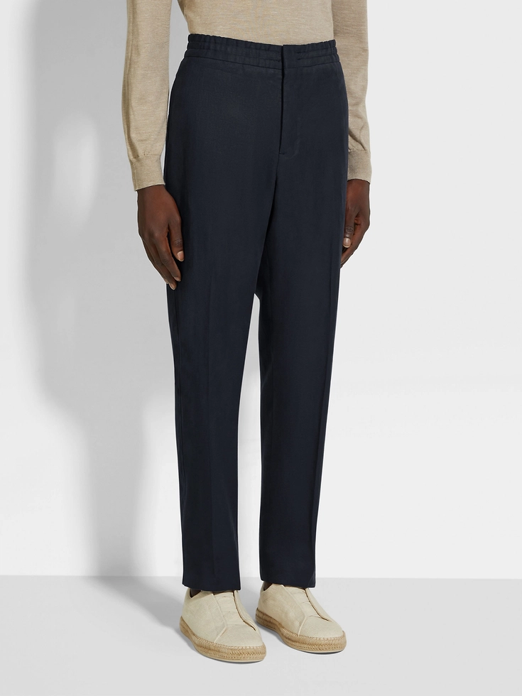 These navy blue pants exude authentic charm through the natural texture of their pure linen weave, crafted from ZEGNA’s fully traceable Oasi Lino fabric. An elasticated waist with inner drawstring imbues comfort into their sleek flat-fronted silhouette.