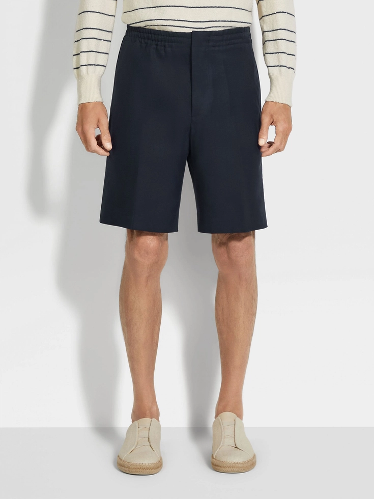 Elevate warm-weather ensembles with the natural charm of pure linen in these navy blue shorts, crafted from Zegna’s exclusive Oasi Lino fabric. Styled with a comfortable elasticated waistband with inner drawstring and back flap pockets.