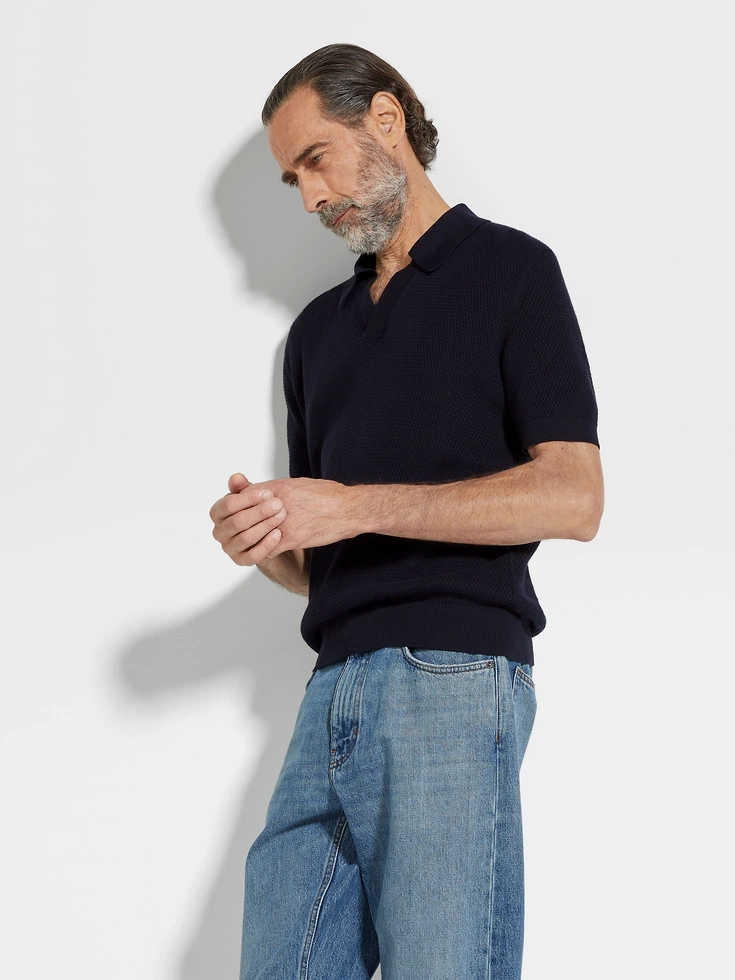 • Regular fit• Small Diamond stitch texture• 14 gauge• Open polo collar• Short sleeves• Ribbed hem and cuffs