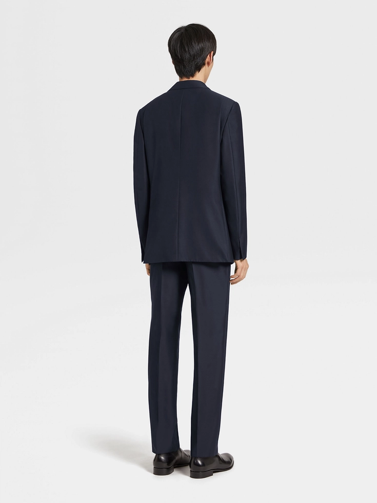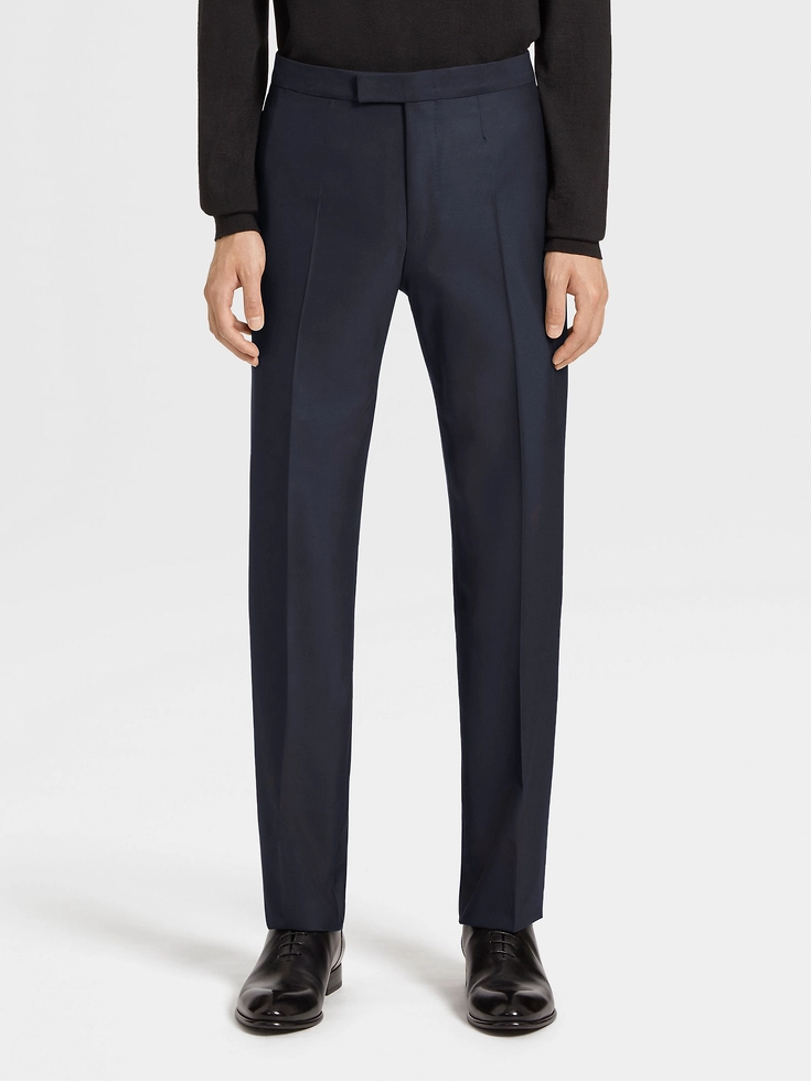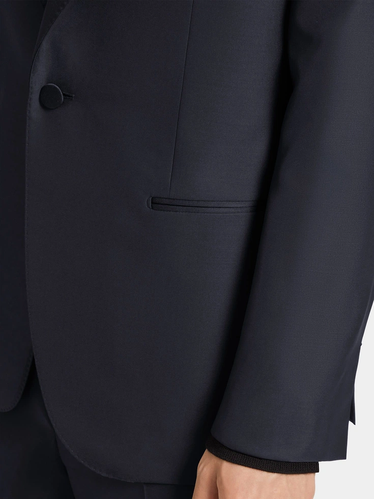 A naturally luminous blend of superfine wool and pure silk gives the navy blue Trofeo™ 600 tailoring evening suit its exceptional finish. Designed for formal events, this sleek navy blue suit accentuates a classic fit with streamlined, peak lapels.
