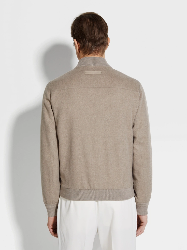 Zegna’s exclusive, extra-fine cashmere is slightly felted to give the light taupe Oasi Cashmere Elements bomber its beautifully textured finish. The jacket is equipped with a water-repellent membrane that preserves these qualities while adding even more protection. This sporty design is finished off with a ribbed bomber collar and ribbed cuffs to match.