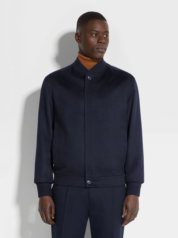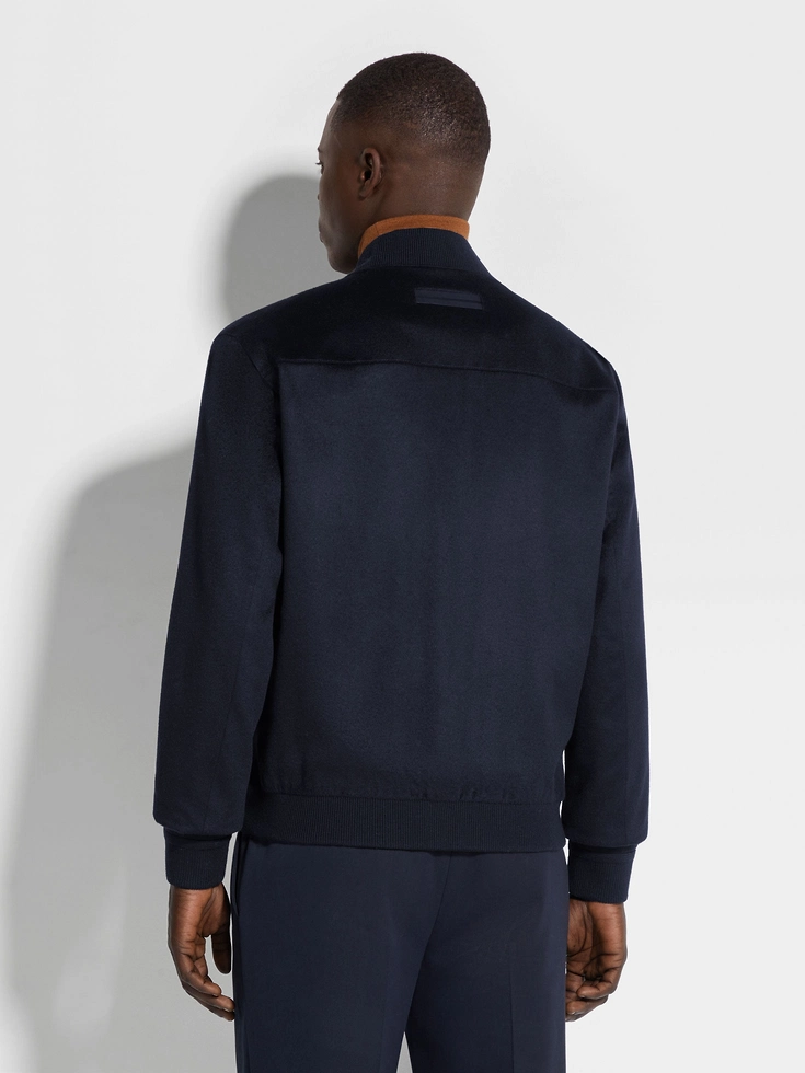 Zegna’s exclusive, extra-fine cashmere is slightly felted to give the navy blue Oasi Cashmere Elements bomber its beautifully textured finish. The jacket is equipped with a water-repellent membrane that preserves these qualities while adding even more protection. This sporty design is finished off with a ribbed bomber collar and ribbed cuffs to match.