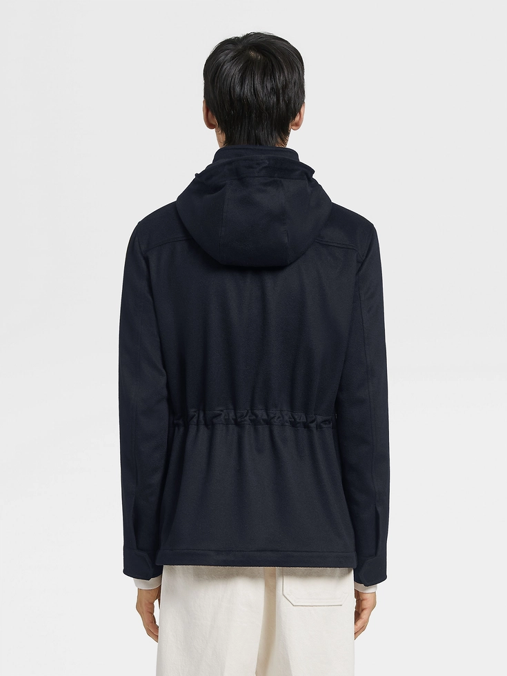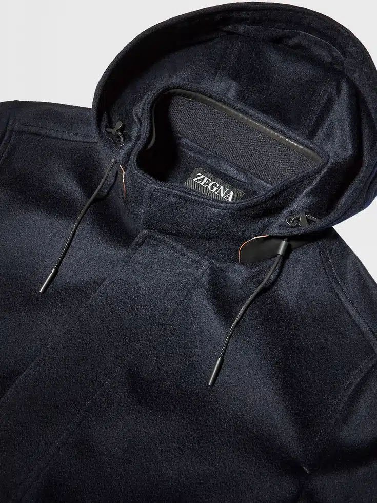 Zegna’s exclusive cashmere is made water-repellent using innovative technology, granting the navy blue Oasi Cashmere Elements Cima overjacket its exceptional weather resistance. The ultra-smooth finish of this luxury fabric elevates any adventure. A hooded stand collar, welt pockets, and leather accents complete the sleek design.CIMA (‘tʃima) — ITALIAN FOR ‘SUMMIT’The inspiration for the Cima Jacket was Born in Oasi Zegna — the home of our values in the Italian Alps. It’s crafted from Oasi Cashmere fibres, which ZEGNA commits to certifying as traceable from 2024. The pinnacle of our outdoor-ready offering, it’s worn for warmth during revitalising hikes.