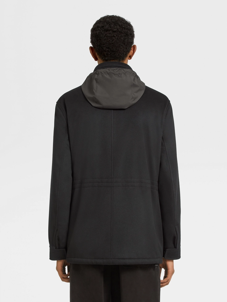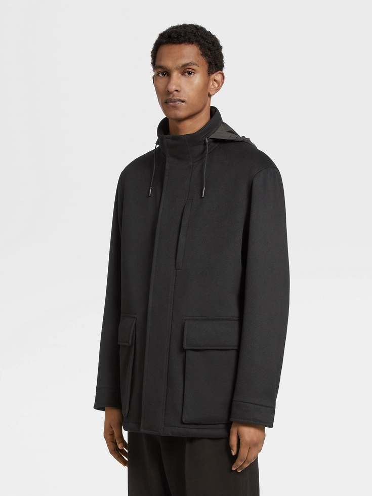 Showcasing one of Zegna’s finest knits, the black Oasi Cashmere Elements padded Vetta overjacket combines plush cashmere with sleek, contemporary lines. The Vetta overjacket’s functional details block out the elements, while the structured silhouette keeps the look elevated. Leather details tie it all together.The inspiration for the Vetta Jacket, Vetta the Italian word for ‘Peak’, was Born in Oasi Zegna — the home of our values in the Italian Alps. It’s crafted from Oasi Cashmere fibres, which ZEGNA commits to certifying as traceable from 2024. It’s ideal weathering the elements wherever your next adventure takes you – from mountain peaks to city streets.