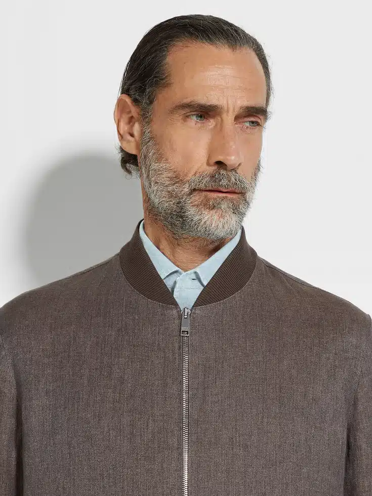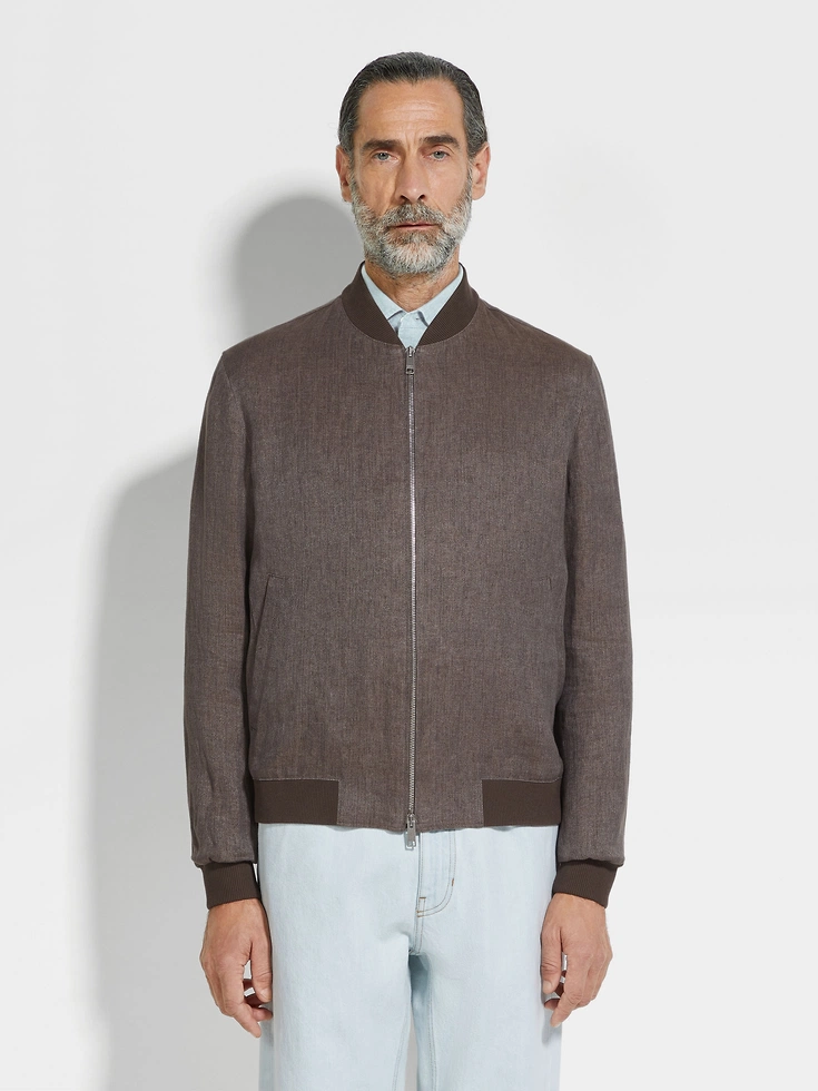Crafted from our exclusive Oasi Lino, this dark taupe pure linen bomber simultaneously embodies Zegna’s vision of elevated leisurewear and sustainable luxury. Lined in silk-cotton, its timeless silhouette is edged with classic ribbed trims.