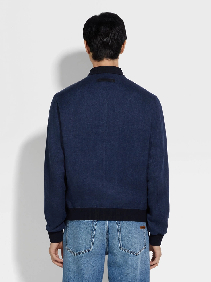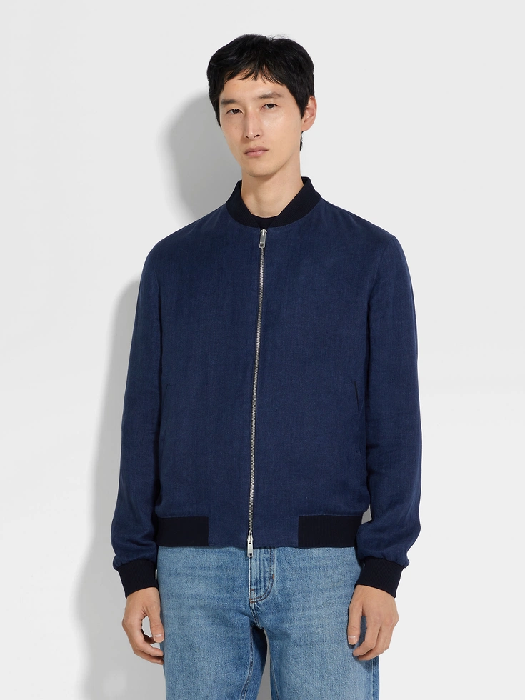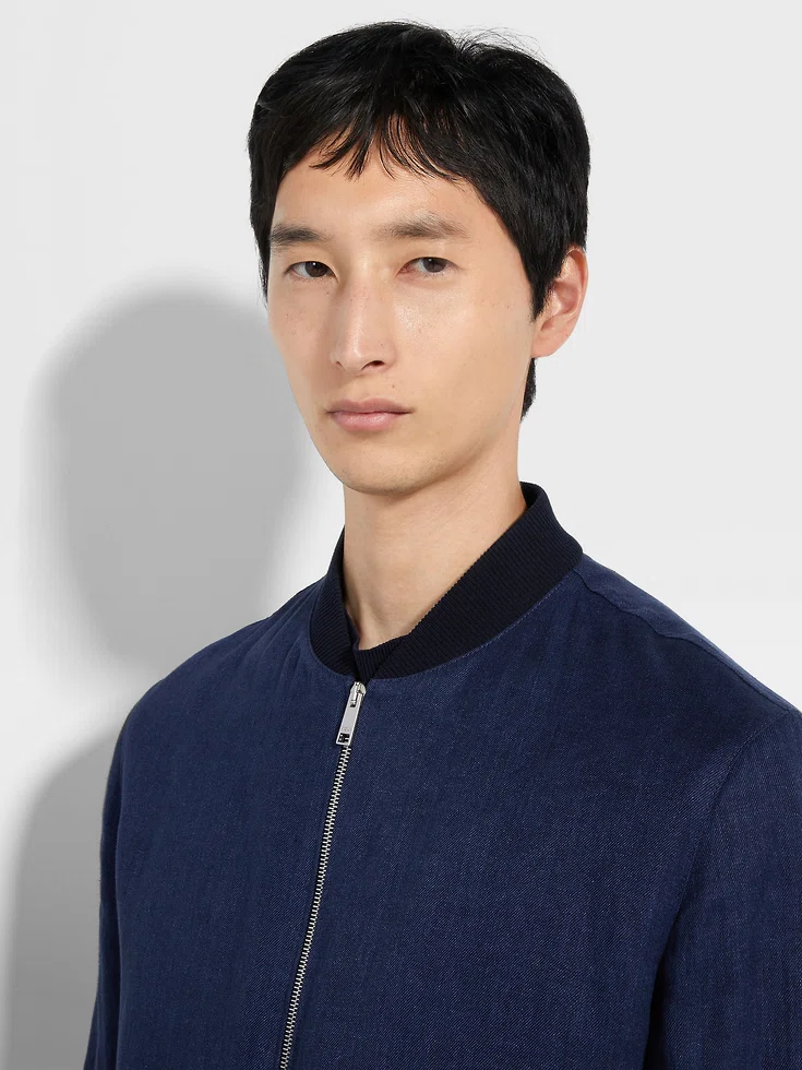 Crafted from our exclusive Oasi Lino, this navy blue pure linen bomber simultaneously embodies Zegna’s vision of elevated leisurewear and sustainable luxury. Lined in silk-cotton, its timeless silhouette is edged with classic ribbed trims.