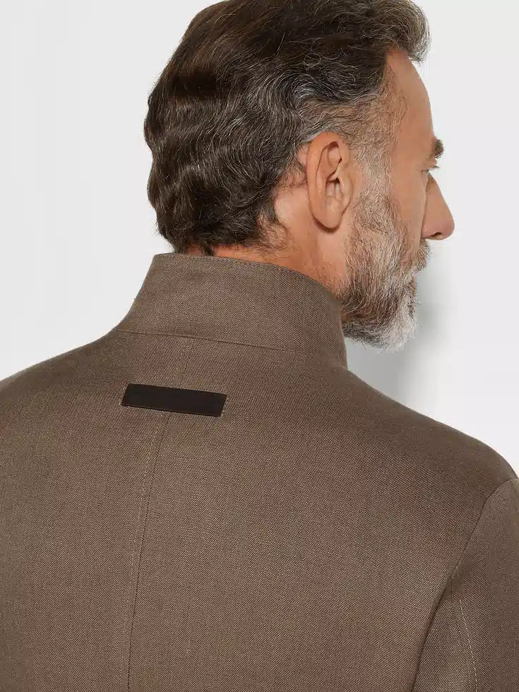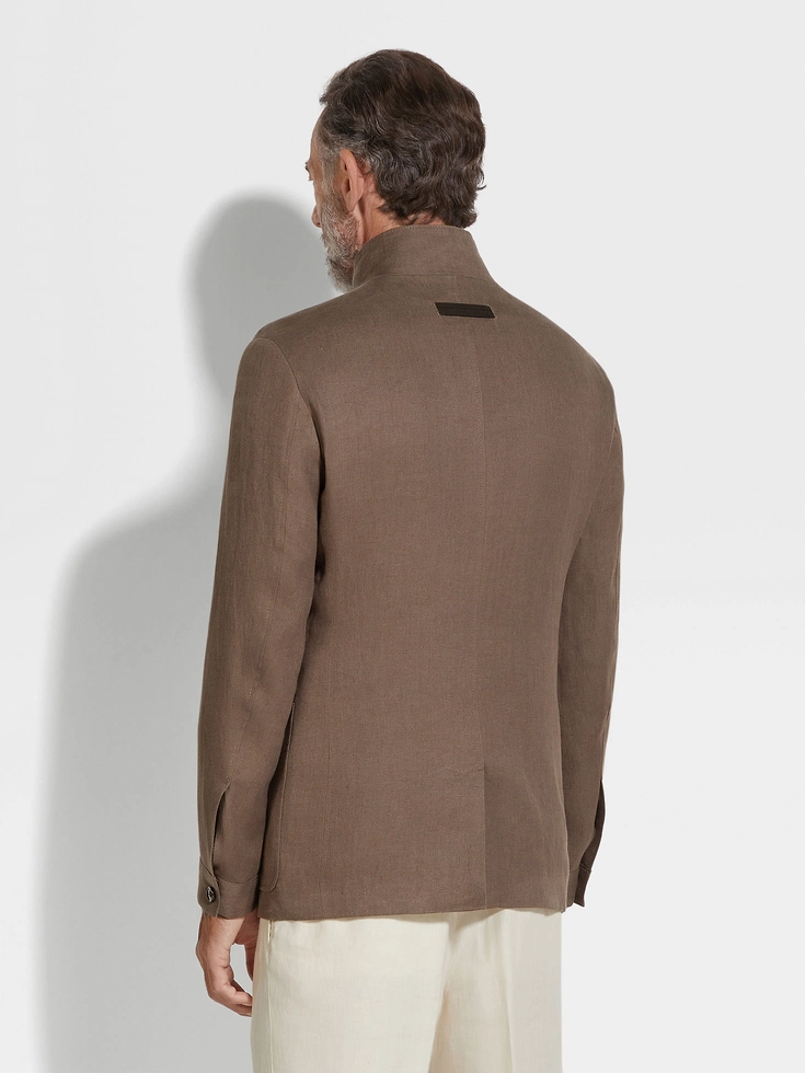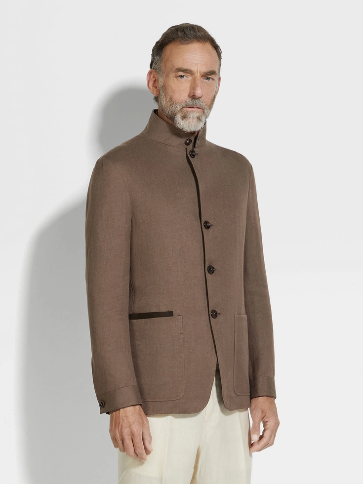 Made from our exclusive Oasi Lino fabric, this dark brown Il Conte chore jacket showcases the natural charm of pure linen and ZEGNA’s firm commitment to traceability. Its deconstructed silhouette is styled with a stand collar for a sleek, minimalist look. Finished with a smart single vent and leather accents.Il Conte jacket pays homage to our Founder, Ermenegildo Zegna. He was bestowed the noble title of Count of Monte Rubello for the legacy he created as an entrepreneur, philanthropist and businessman.