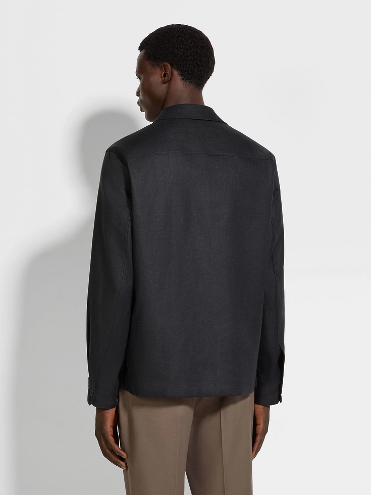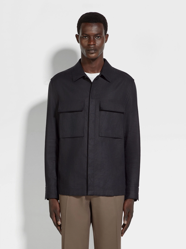 Main body: 100% LinenLeather details: CalfskinThe inspiration behind this Oasi Lino garment was Born in Oasi Zegna, a 100km² natural territory and the home of our values. Crafted from European-grown flax fibres that are certified as 100% traceable from 2024, Oasi Lino follows in the footsteps of our founder, who envisioned a vertically integrated system of producing textiles.Do not wash. Do not bleach. Do not tumble dry. Iron at max 110°C. Professional dry cleaning in tetrachloroethene and hydrocarbons, mild process.