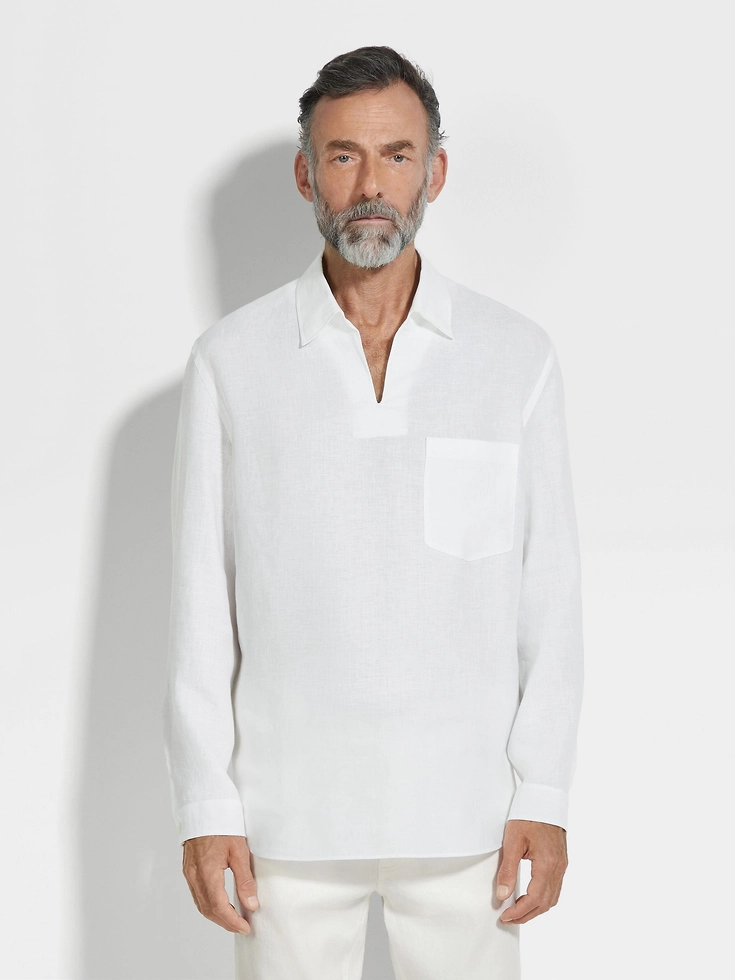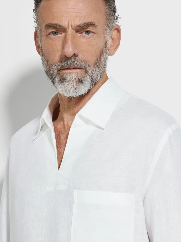 The epitome of effortless sophistication, our white Oasi Lino Polo Shirt is a casual wardrobe staple, made from resilient flax fibers that feel naturally crisp, lightweight and breathable against the skin. A vareuse collar and chest pocket add a refined touch.