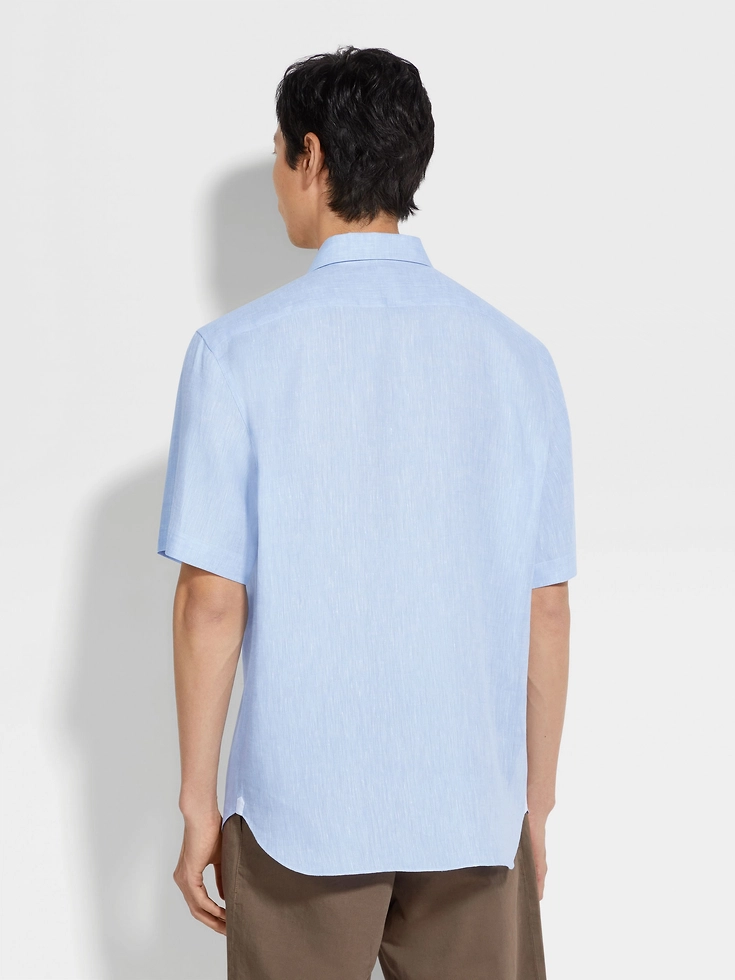 Made from a lightweight natural material, the light blue Oasi Lino short-sleeve shirt feels fresh against the skin. The short-sleeve shirt is styled with a one-piece collar and hand-stitched details.