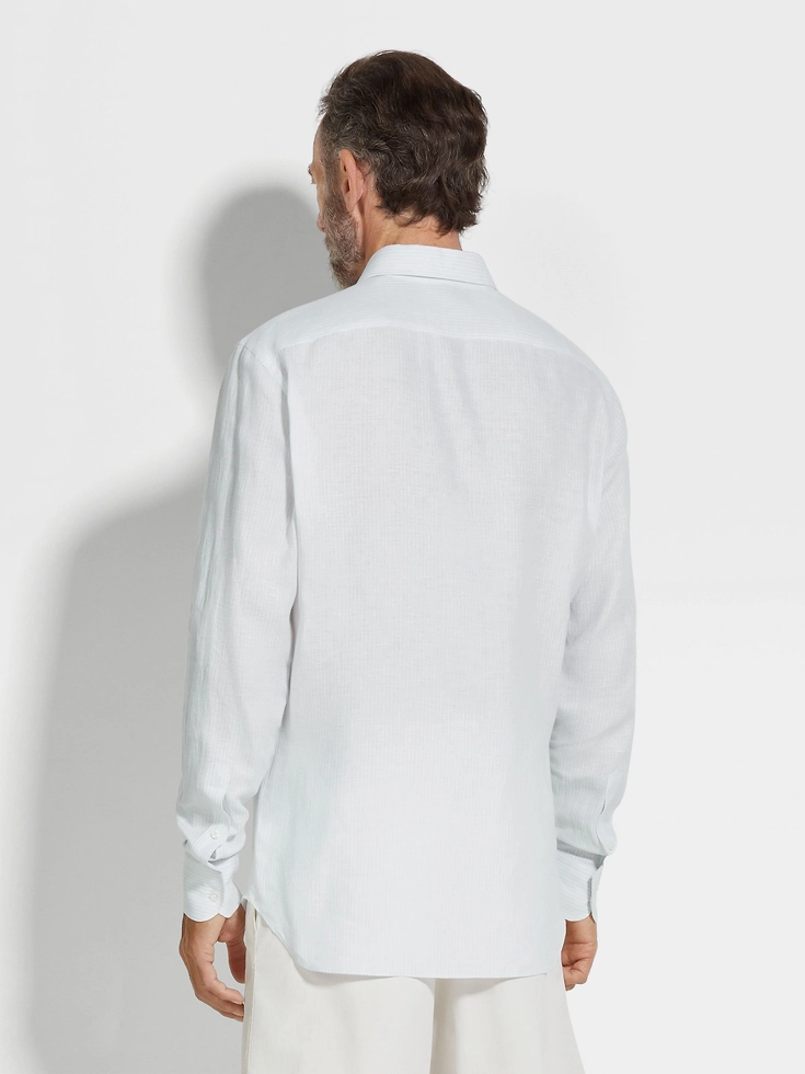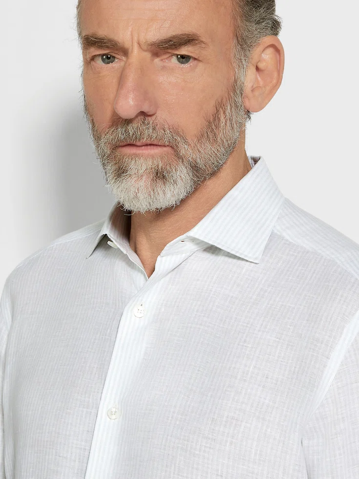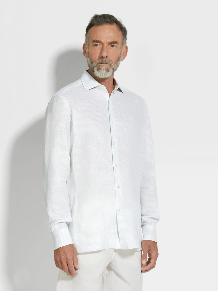 This Oasi Lino shirt exudes authentic charm thanks to the distinctive texture of its pure linen weave: soft, breathable, and key for creating elegant warm-weather looks. Its timeless light blue and white striped design is enriched with hand-stitched detailing. Styled with a semi-spread collar.