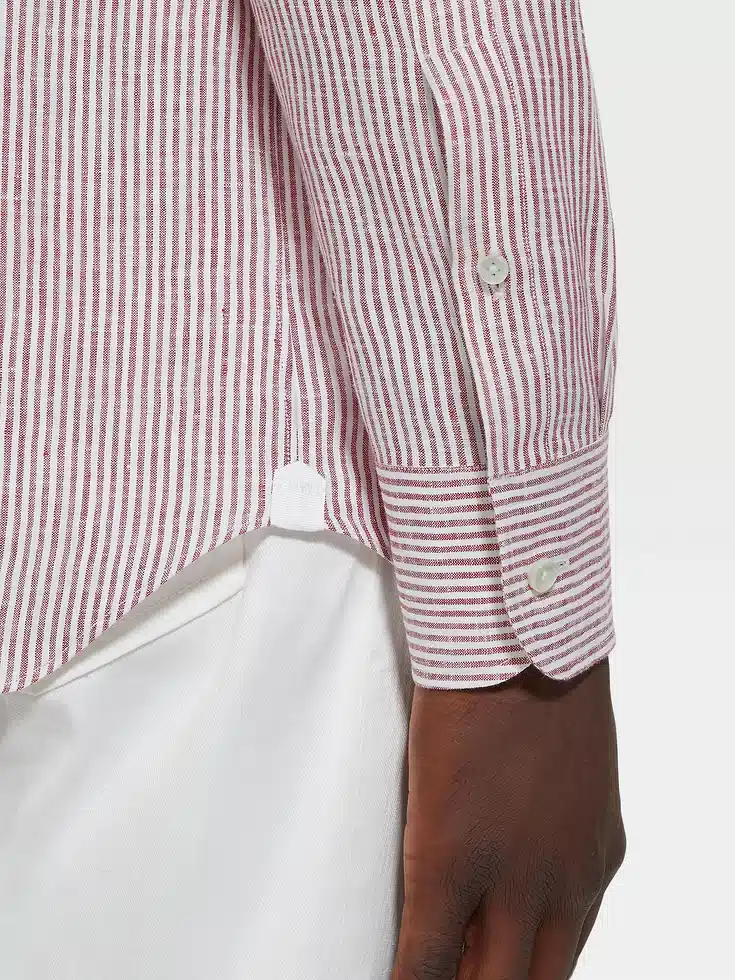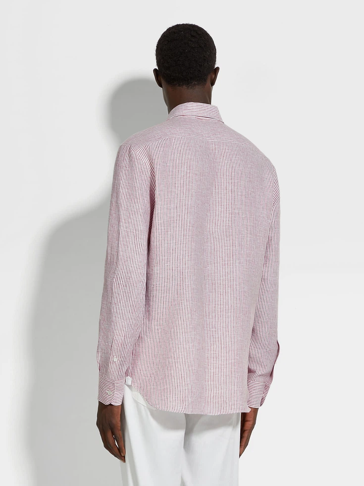 This Oasi Lino shirt exudes authentic charm thanks to the distinctive texture of its pure linen weave: soft, breathable, and key for creating elegant warm-weather looks. Its brick red and white striped design is enriched with hand-stitched detailing. Styled with a semi-spread collar.