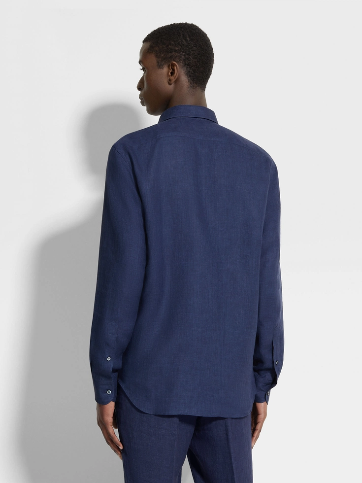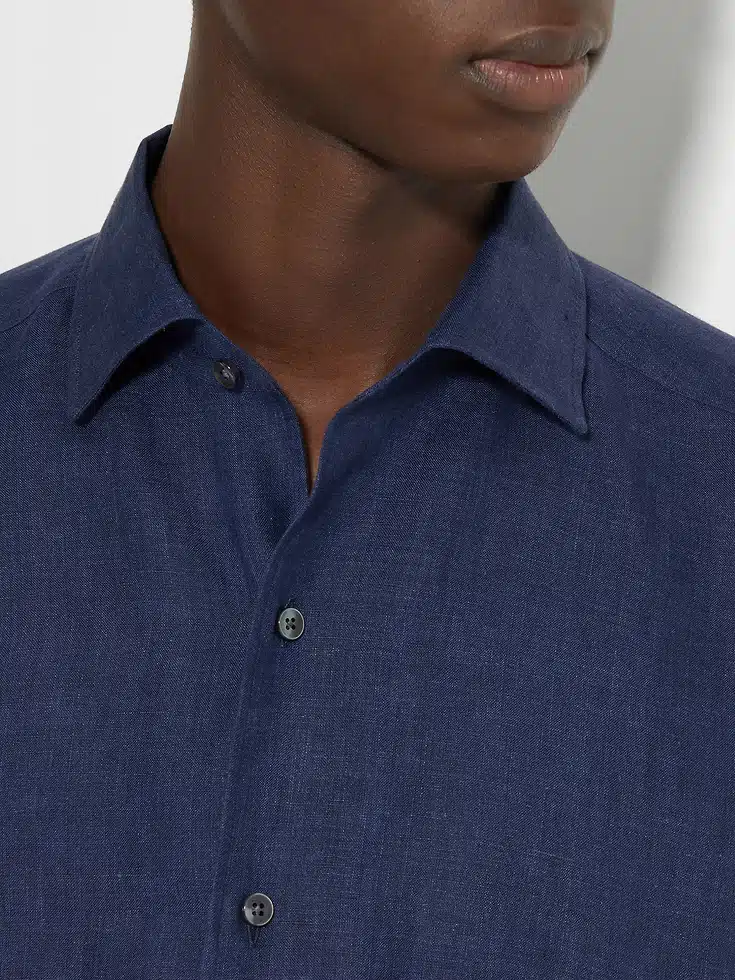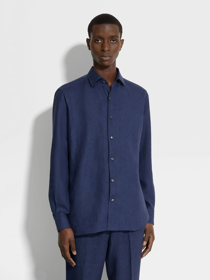 The natural texture of pure linen shines in the navy blue Oasi Lino shirt. This lightweight, naturally breathable material connects contemporary leisure looks to a legacy of fine menswear. The Oasi Lino long-sleeve shirt is styled with a one-piece collar and enhanced with hand-stitched details.