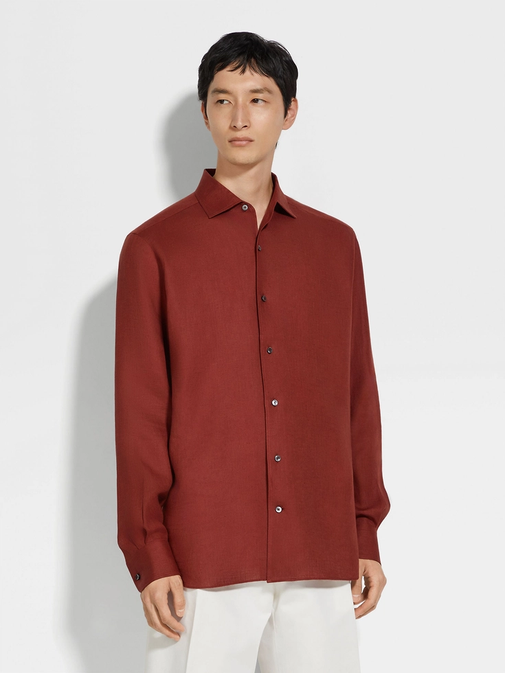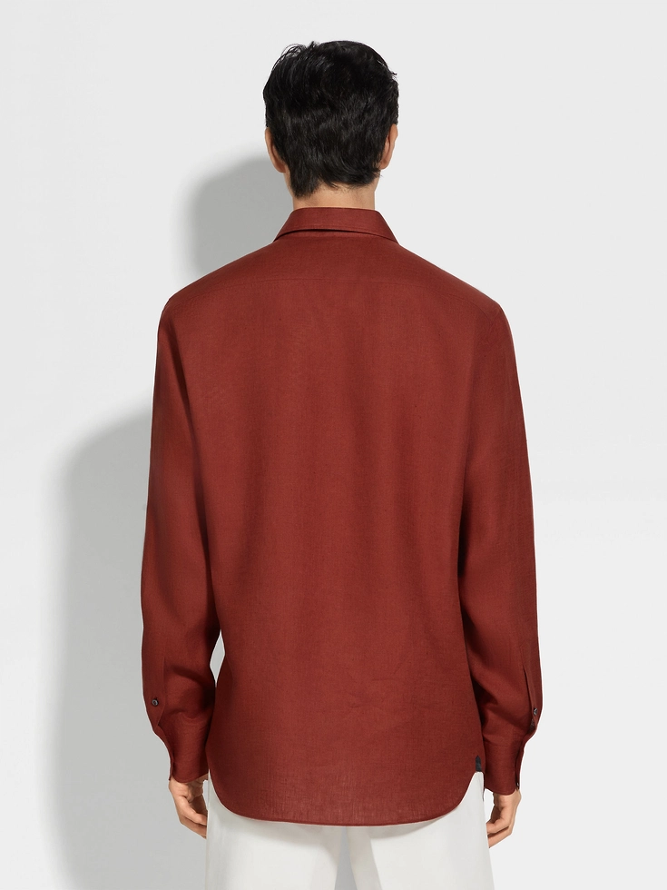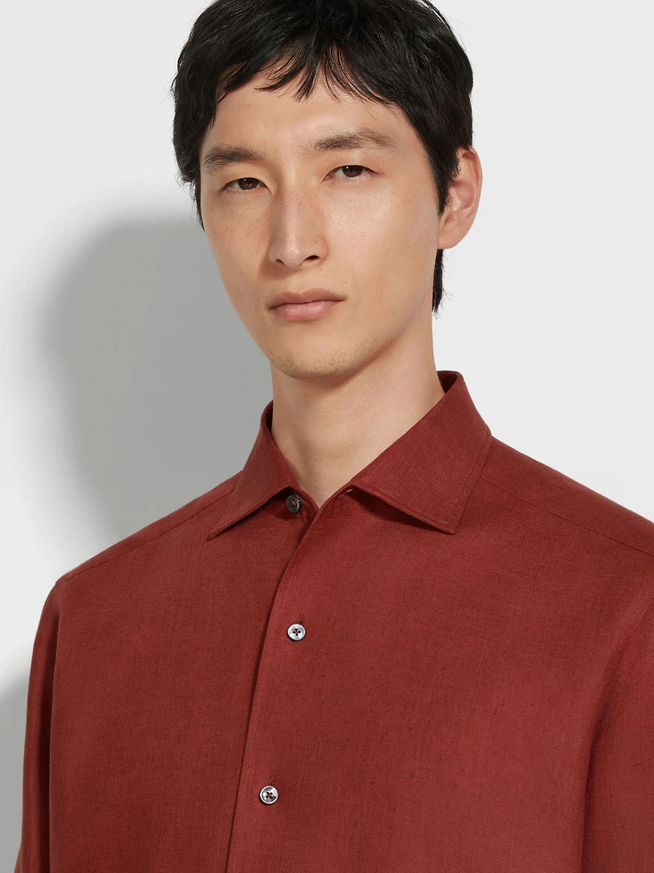 This long-sleeved shirt with rounded hem is made from Zegna’s exquisite Oasi Lino, spun from 100% traceable, European-grown fibers. Hand-stitched detailing enriches its brick red colorway.