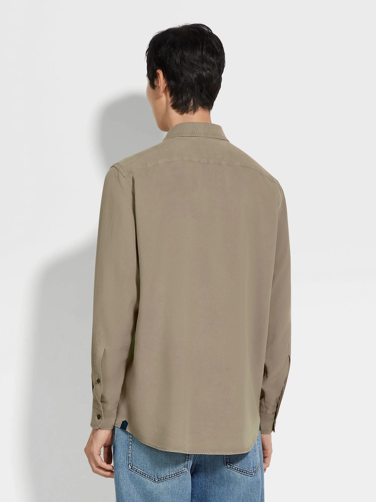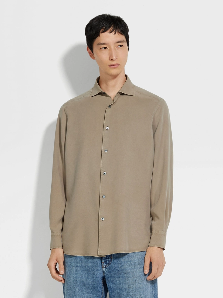 Indulge in the luxurious allure of pure silk with this garment-dyed light taupe shirt. Its sleek long-sleeve silhouette is styled with a semi-spread collar, standard cuffs and a crisp straight hem.