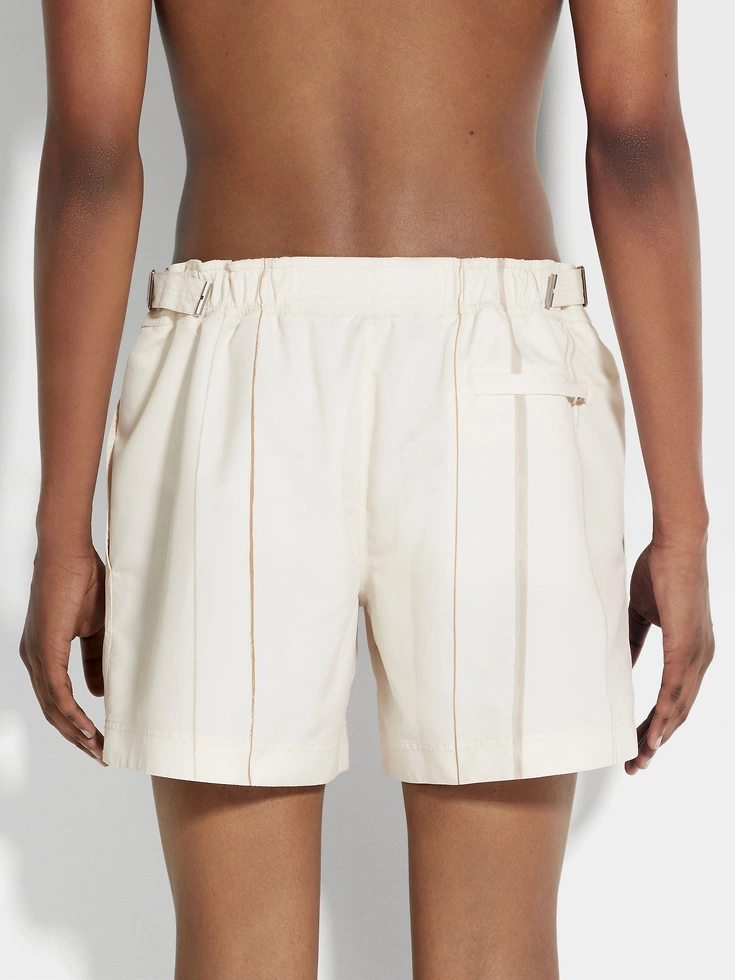 Made from soft-hand fabric, the beige swim trunks feature adjustable side fasteners and have a mid-length cut. The embroidered ZEGNA Logo signs off the look.